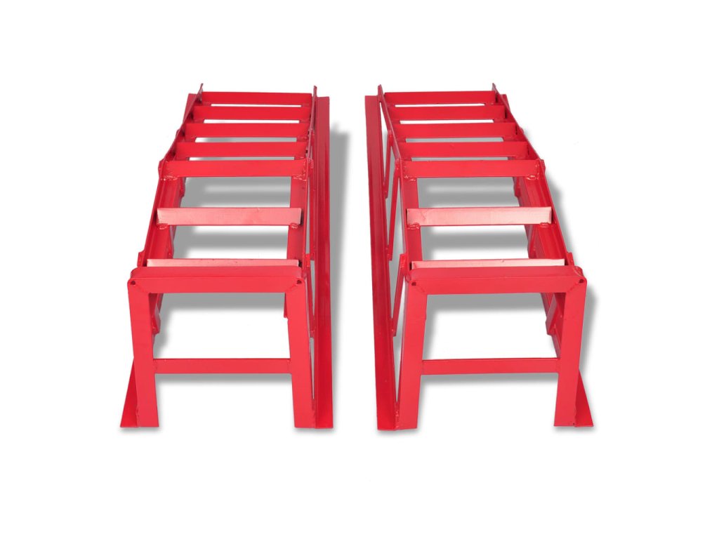 Táto dvojica oceľových automobilových rámp je vhodná pre automatické vystavenie alebo údržbu. Sú vyrobené z 3mm oceľového plechu s červenou korózii odolnou striekanou úpravou. Každá auto rampa má kapacitu 1000 kg, vhodná pre vozidlá s max. šírkou pneumatík 235mm (berte do ohľadu, že šírka pneumatiky môže presiahnuť šírku rampy, ale bude visieť mimo povrchu rampy). Zastavka je nastavena na prednej časti rampy pre bezpečnosť, a oceľové priečniky v intervaloch zabránia pneumatikám sa pošmyknuť z povrchu.