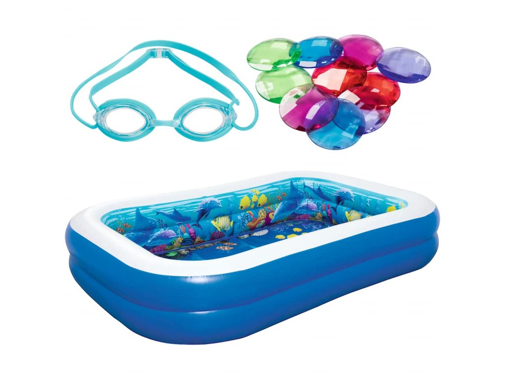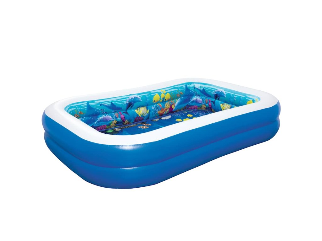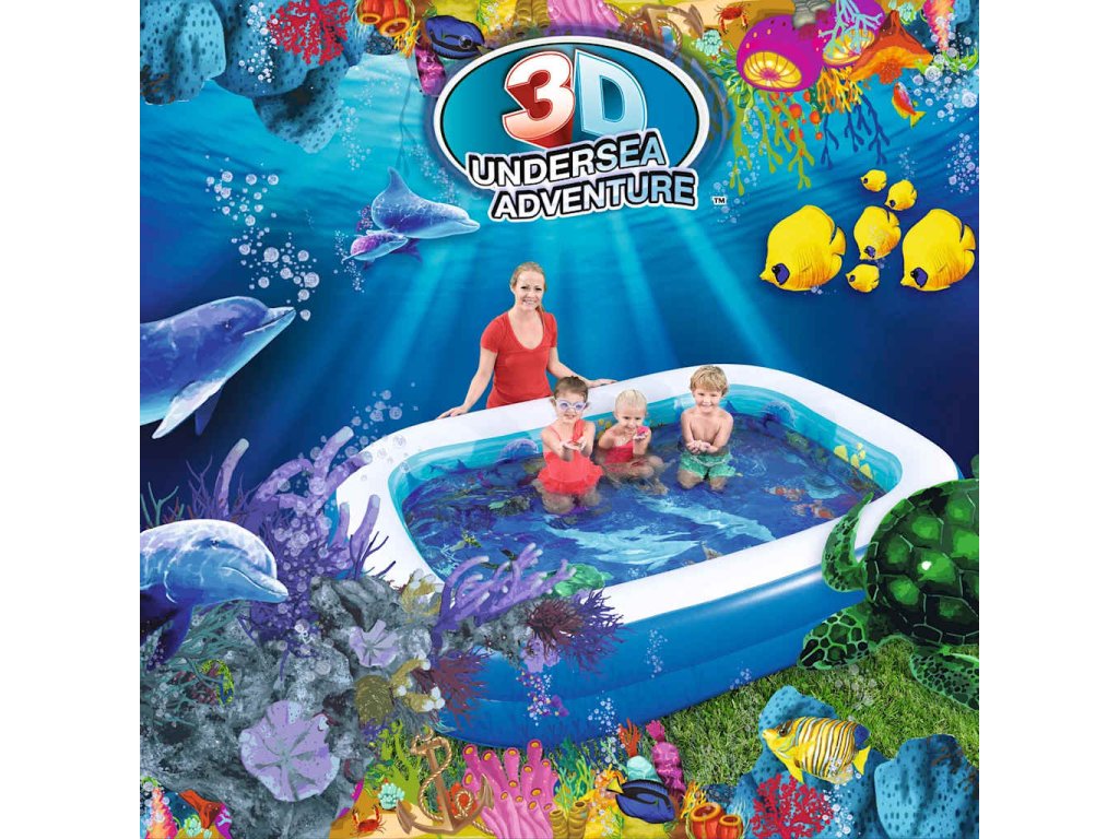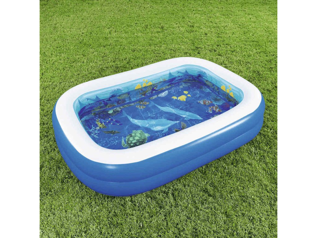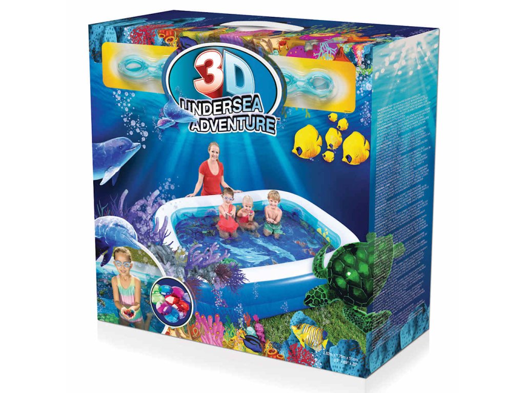 Vďaka vysoko kvalitnej vinylovej konštrukcii v tvare písmena I je tento bazén veľmi odolný. Zmestí sa do neho až 778 litrov vody. Bazén je navrhnutý s mimoriadne širokými bočnými stenami pre vyššiu stabilitu. Tento bazén sa dá rýchlo nafúknuť a vyfúknuť. Nasaďte si 3D okuliare a obdivujte krásny podmorský svet a krištáľové poklady priamo pred očami!
