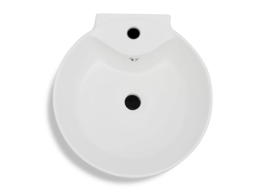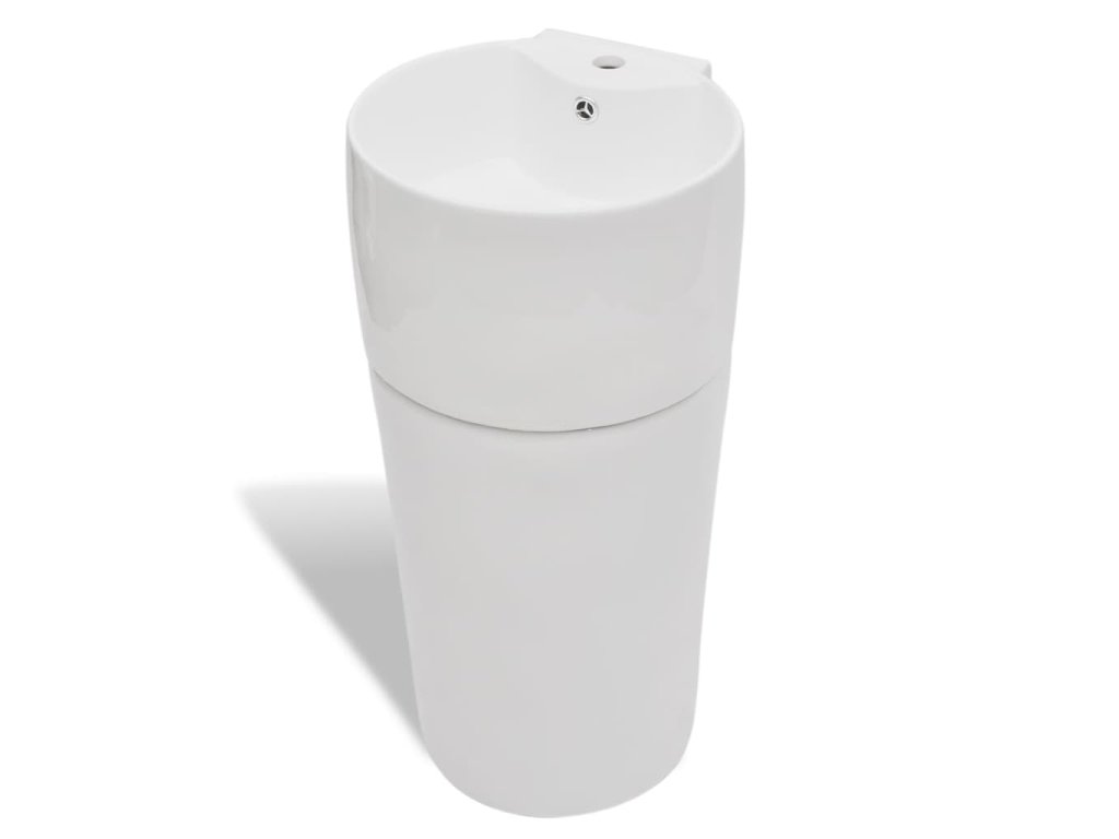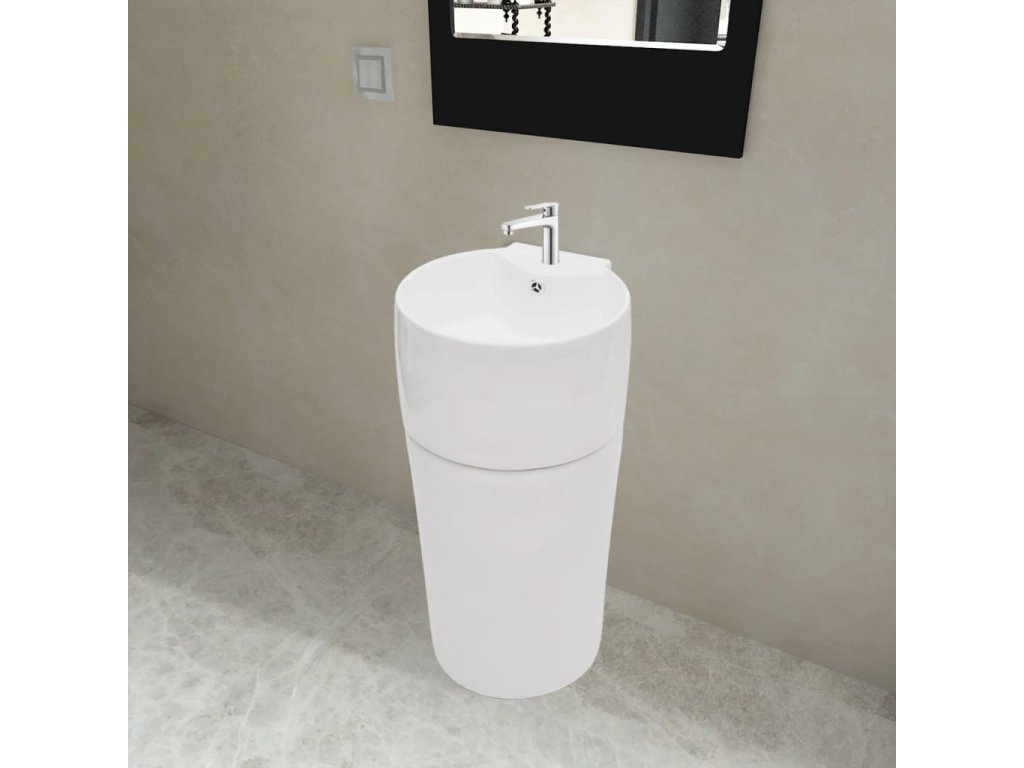 Biele stojace okrúhle keramické umývadlo do kúpeľne s prepadom a otvorom na batériu