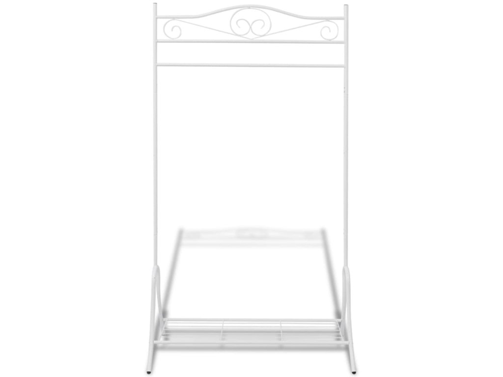 Vešiak s elegantnými dekoratívnymi prvkami je nielen praktický, ale zároveň ozdobí váš interiér. Vešiak na oblečenie je tvorený pevnou oceľovou konštrukciou, vďaka čomu je ľahký, ale robustný. Na policu v spodnej časti si môžete poukladať topánky alebo košíky.