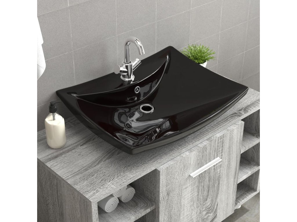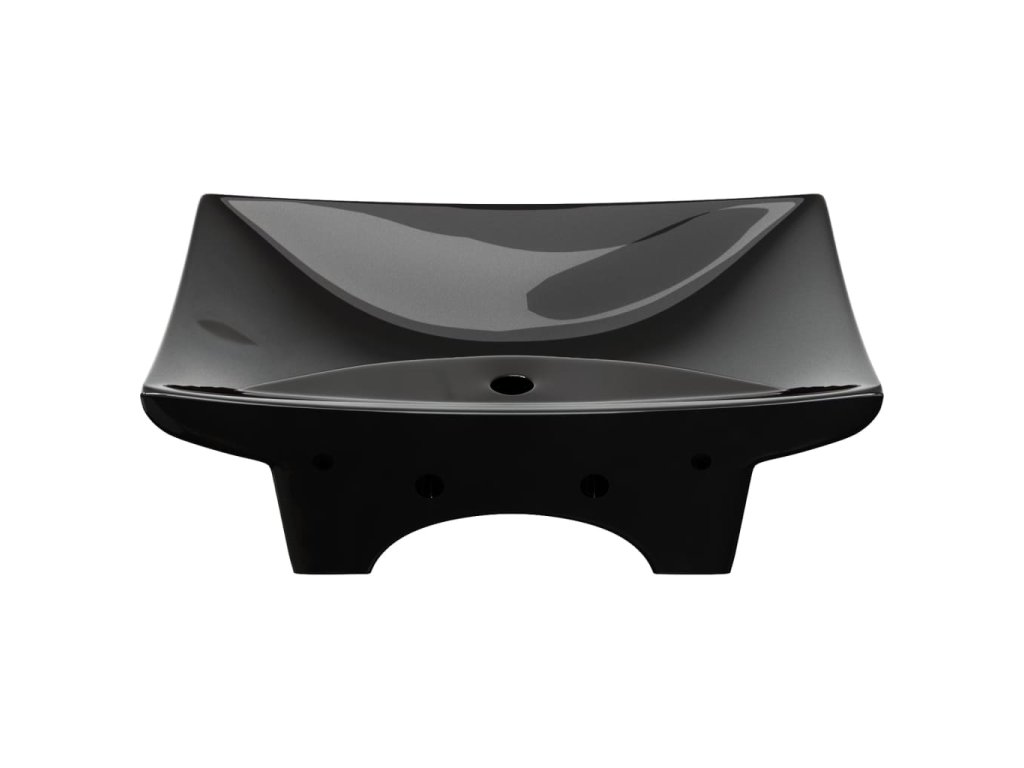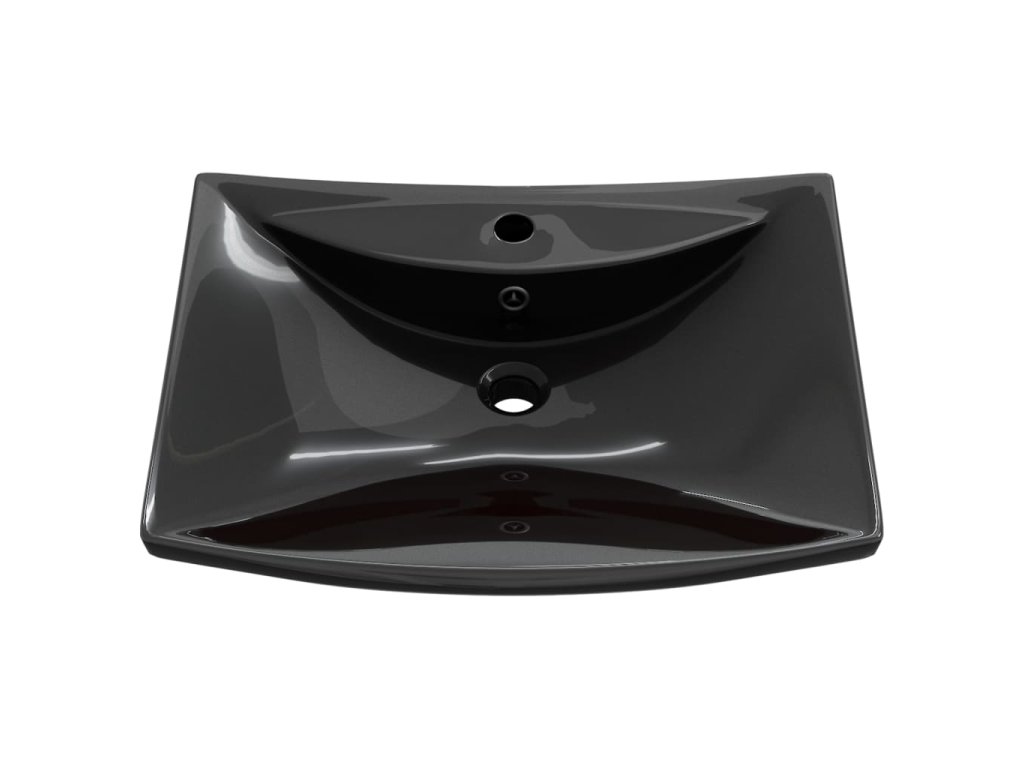 Čierne luxusné keramické umývadlo v tvare obdĺžnika s prepadom a otvorom na batériu