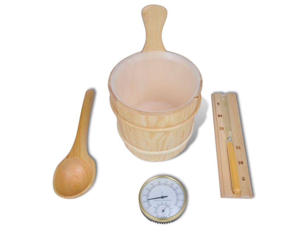Tieto doplnky do sauny obsahujú vedro, plastovú vložku vo vedra, naberačku, presýpacie hodiny a teplomer a vlhkomer v jednom, a predstavujú nevyhnutnú súčasť každej sauny.