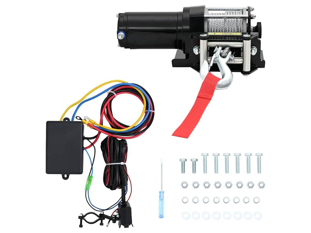 Zásielka zahŕňa: 1 x navijak, 1 x montážny tanier, 1 x valec, 1 x hák s káblom, napájací kábel a montážne príslušenstvo ako skrutky a matice.