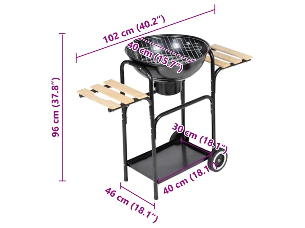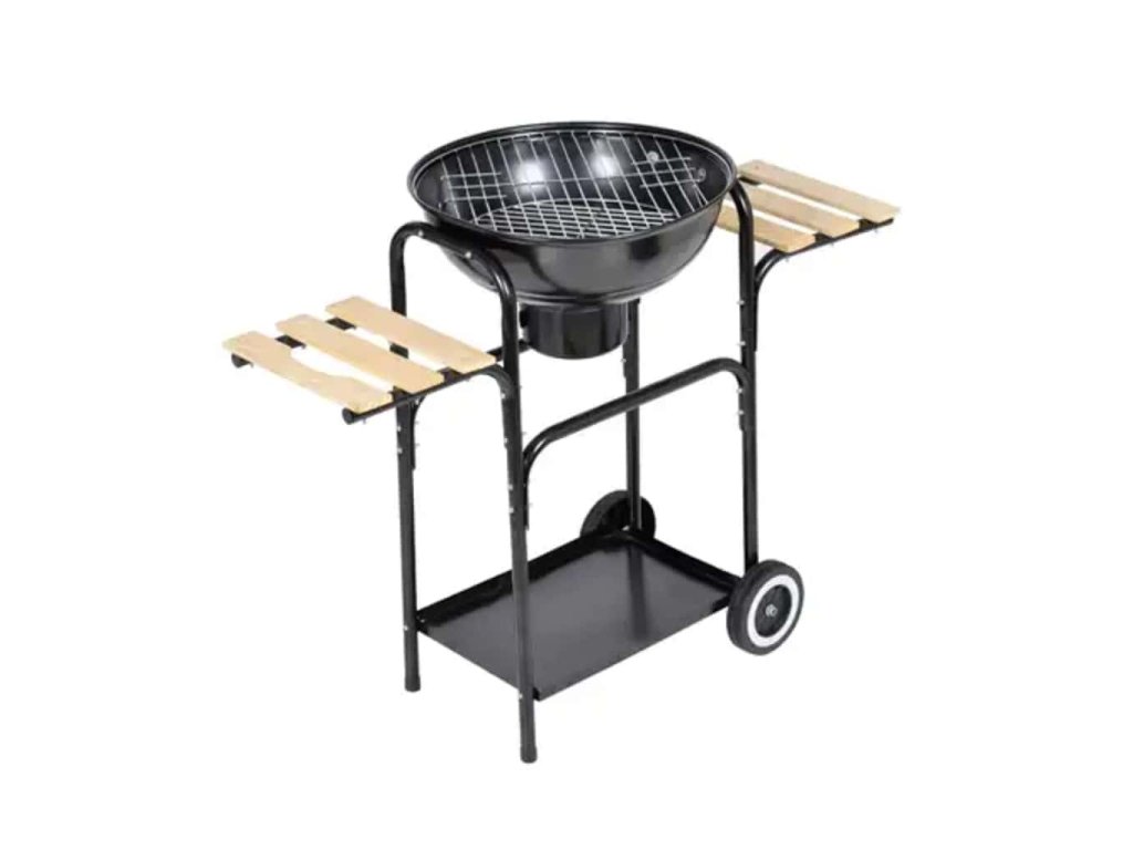 Tento charakteristický gril pracuje na drevo a uhlie. Pre ovládanie ventilácie je drevená rukoväť na kryte (týmto spôsobom nebudete si spaľovať ruky). Na bokoch sú 2 pracovné stoly, tiež z dreva, a má aj spodnú policu, ktorá sa hodí pre ukladanie príslušenstva na grilovanie, a má dve kolesá, čo vám umožní ľahké prenášanie grilu.