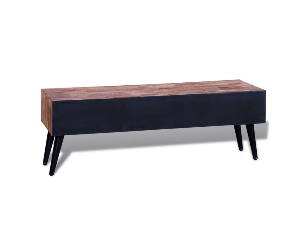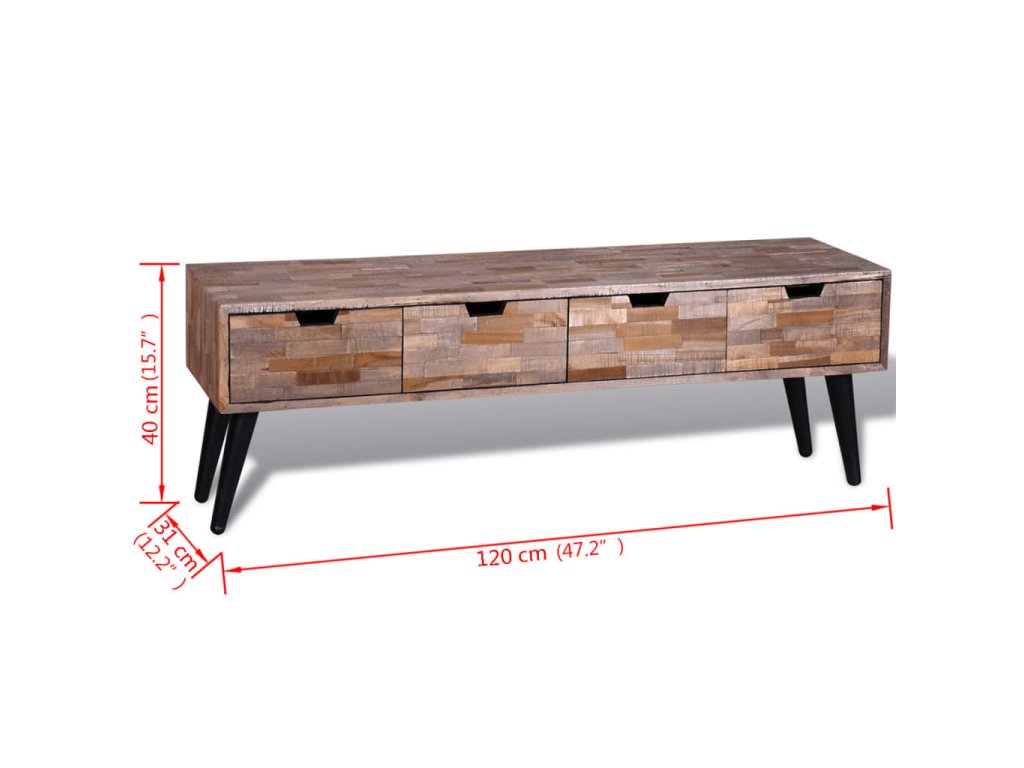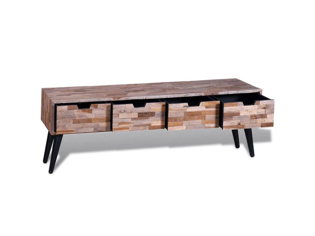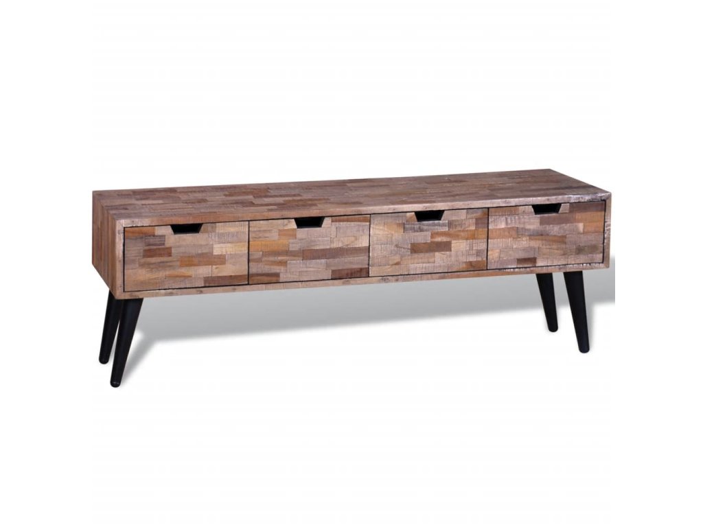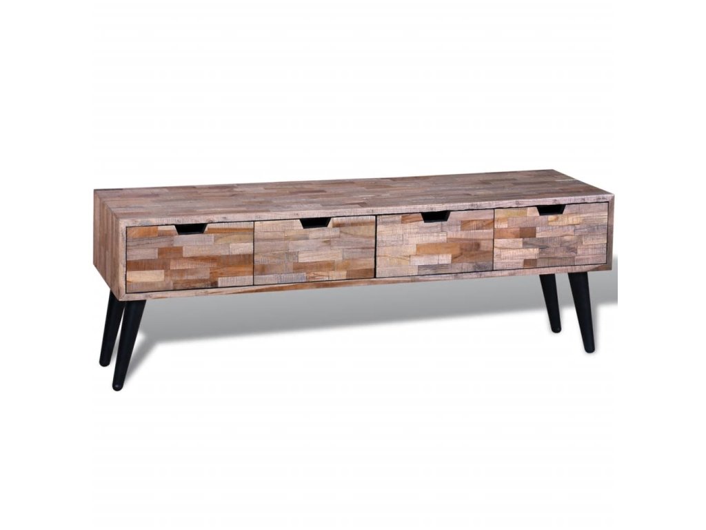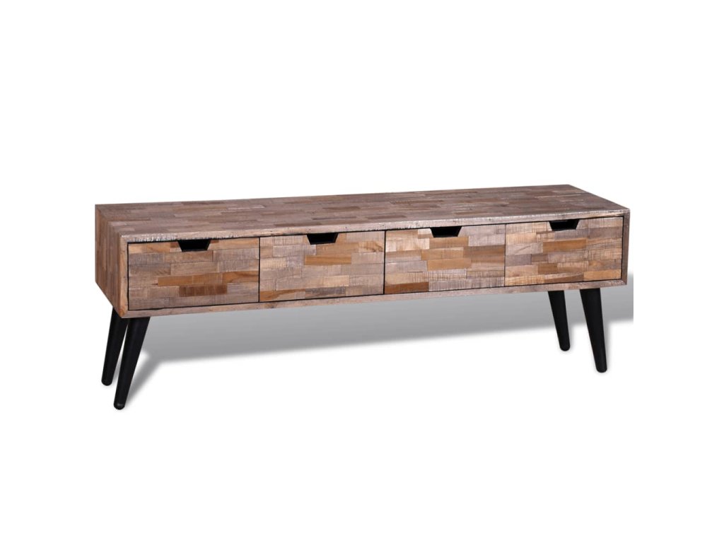 Táto skrinka na TV je vyrobená z recyklovaného tíkového dreva, má štýlový dizajn s vintage prvkami a predstavuje praktický doplnok do každej obývačky či spálne. Štyri veľké zásuvky poskytujú dostatok priestoru na odkladanie rôznych predmetov.