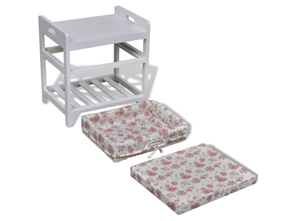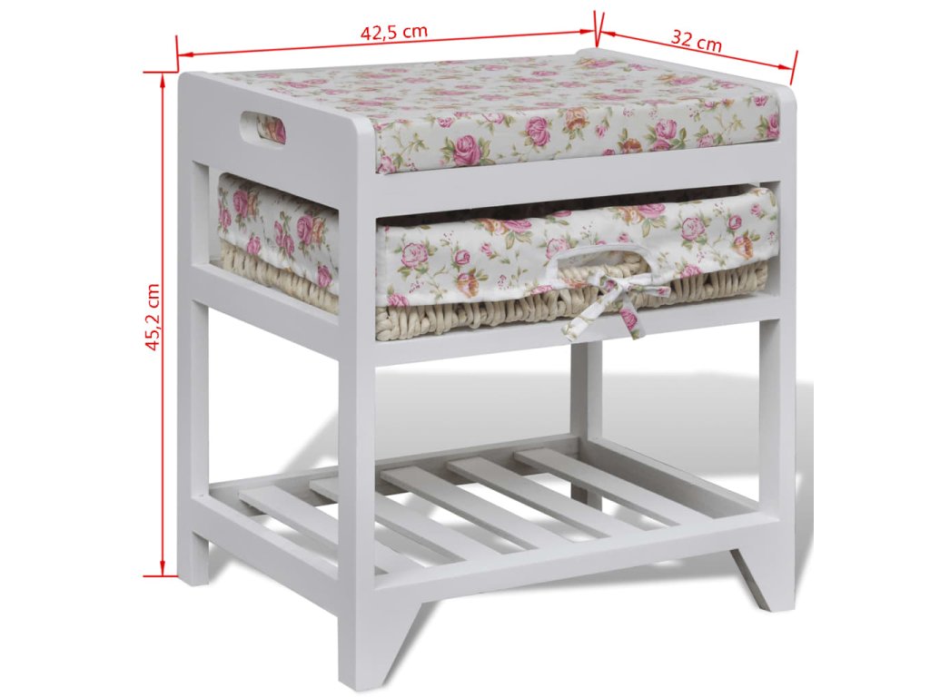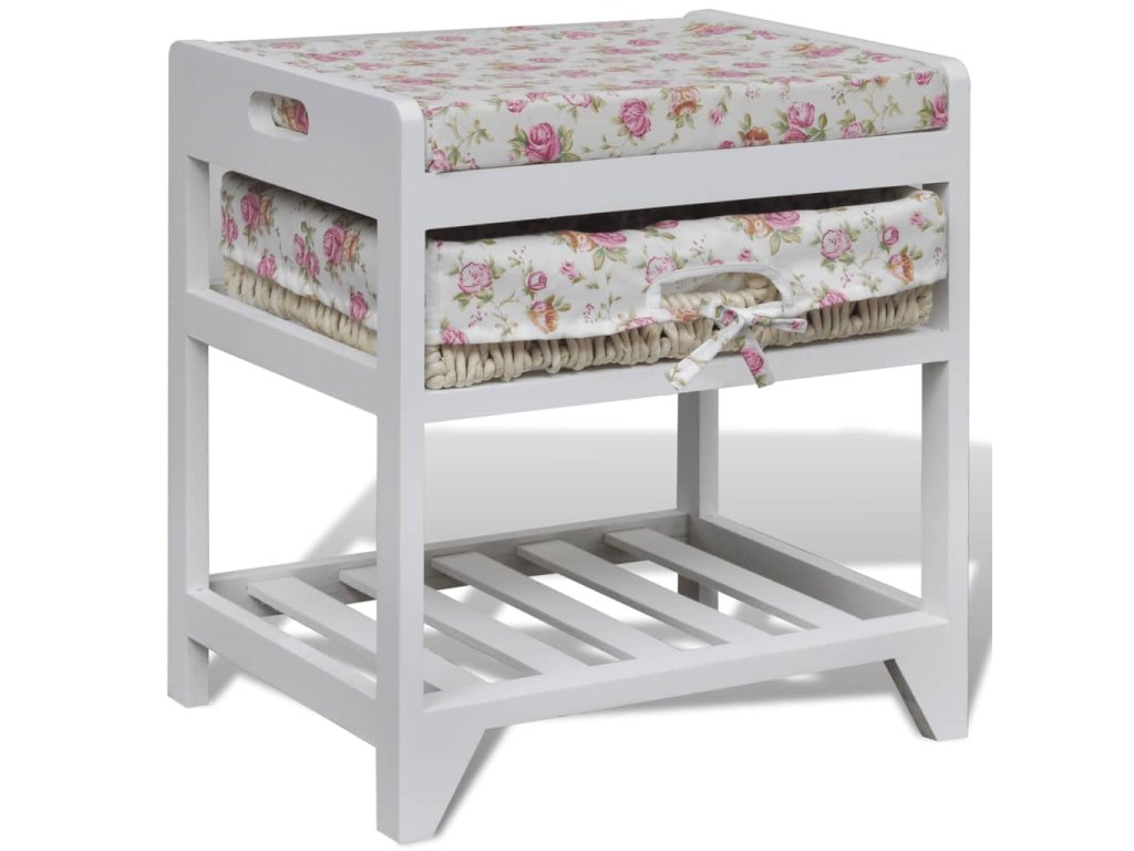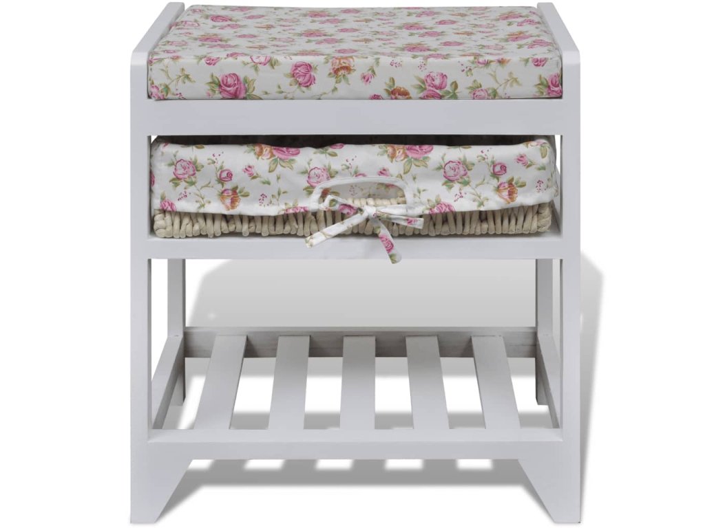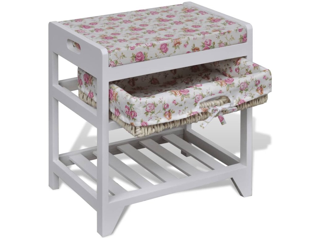 Táto drevená lavička s podložkou na sedadlo vyplnenou hustým molitanom, košíkom a priestorom na topánky predstavuje praktické miesto, na ktoré sa môžete posadiť, keď si obúvate či vyzúvate topánky.