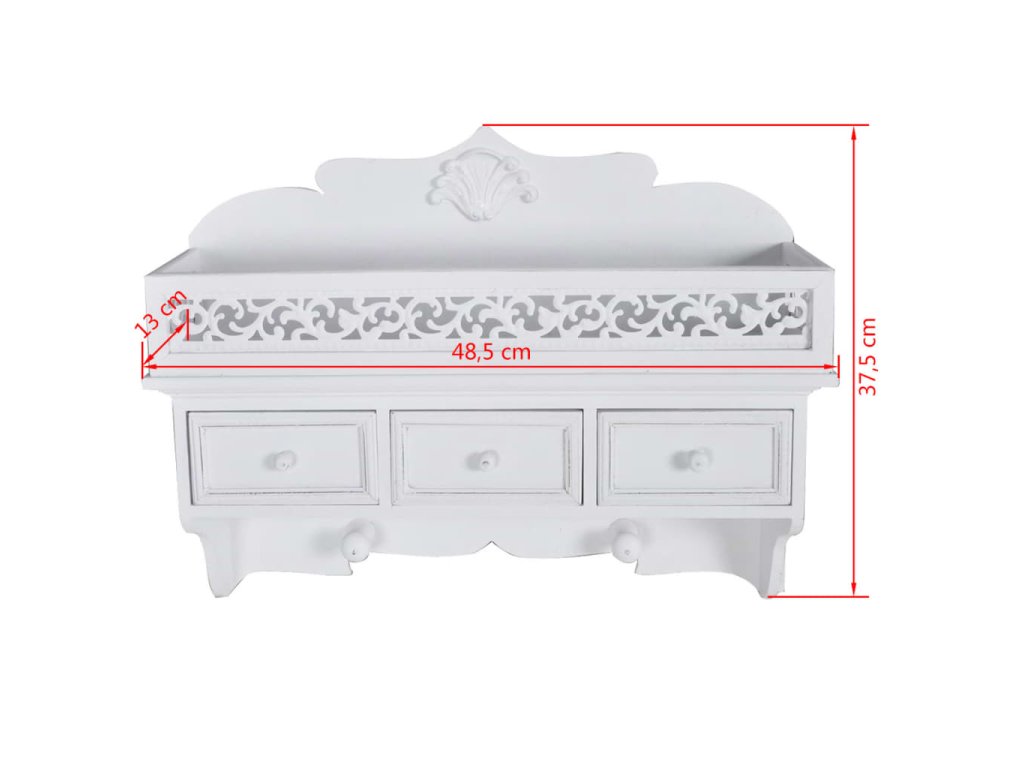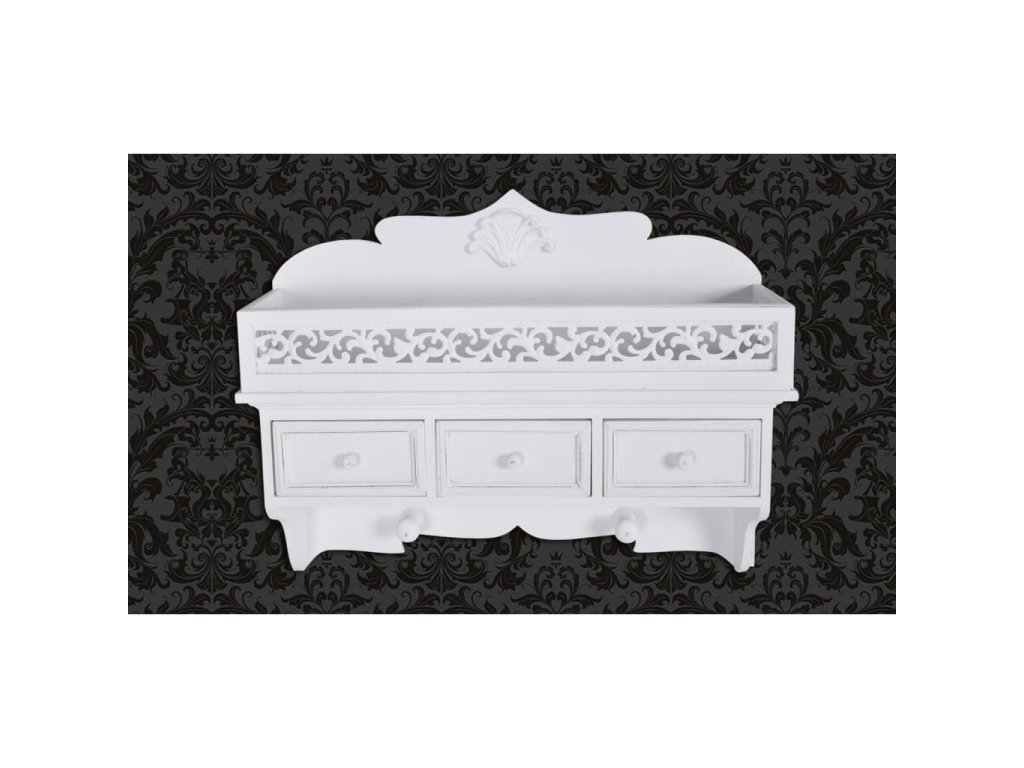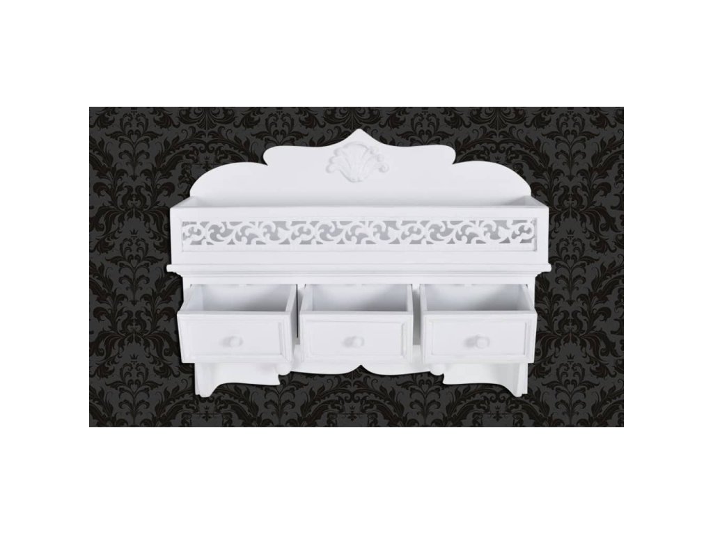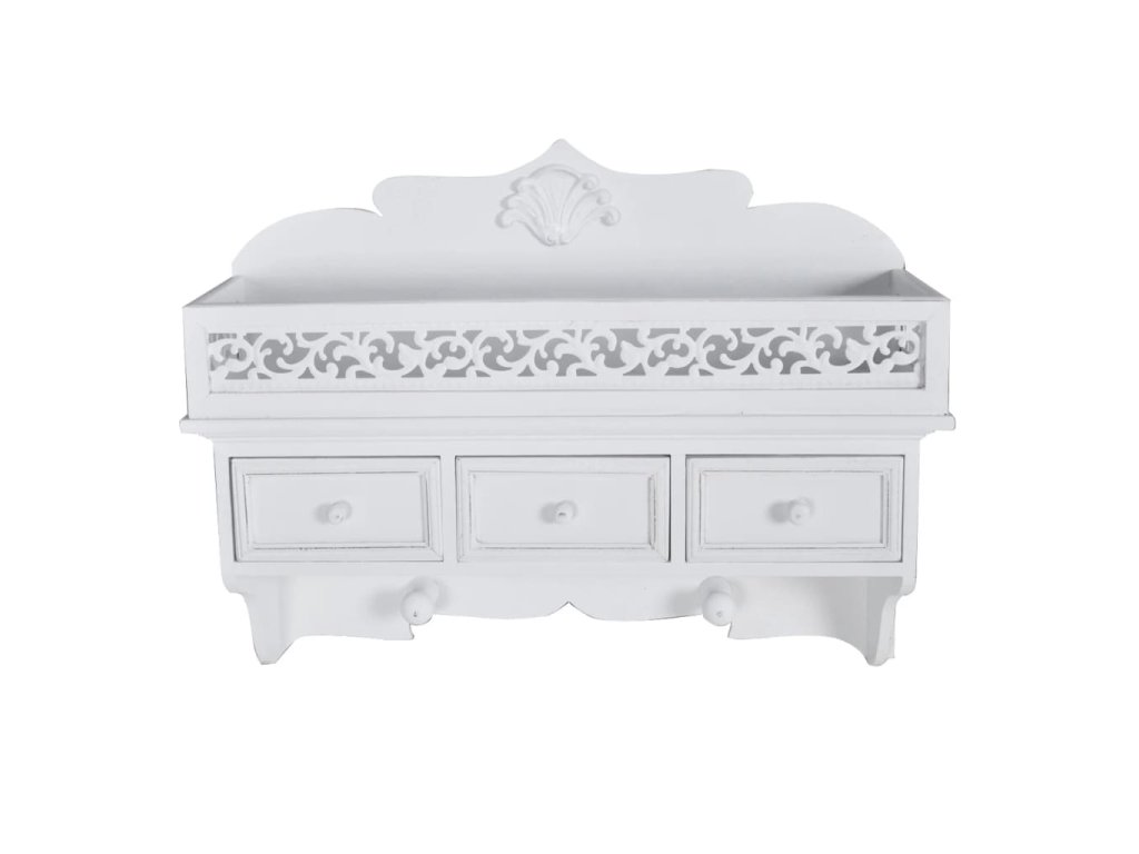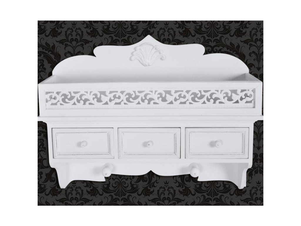 Táto biela nástenná polica s 3 zásuvkami sa vyznačuje klasickou eleganciou a predstavuje univerzálny kúsok do malých spální a hosťovských izieb, kde potrebujete vytvoriť ďalší úložný priestor. Môžete ju využívať aj ako vešiak s dvoma háčikmi v spodnej časti.