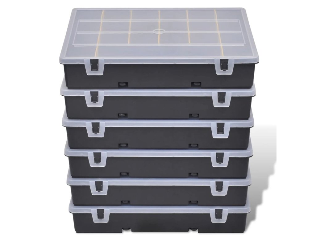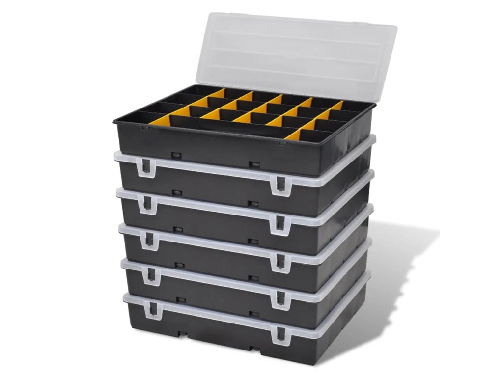 Robustná plastová sada boxov na náradie sa skladá zo 6 kusov a je ideálnym pomocníkom na odkladanie skrutiek, matíc a iných drobných pomôcok. Každý box má 21 častí, ktoré vám pomôžu udržať poriadok v drobnostiach a zabezpečiť ich pohodlné používanie.