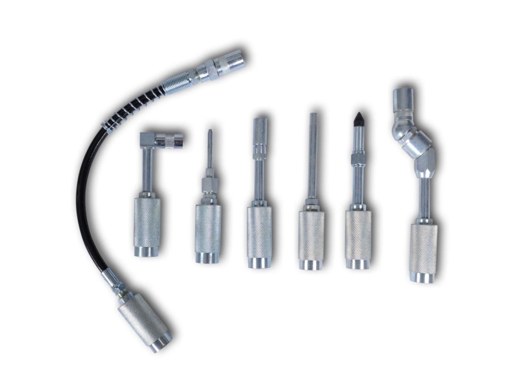 V balení sú: 90-stupňová mazacia hlavica, rovné predĺženie, 400 mm predlžovacia hadica, nasúvacia 90-stupňová spojka, gumová špica, ihlová špica a 360-stupňová spojka.