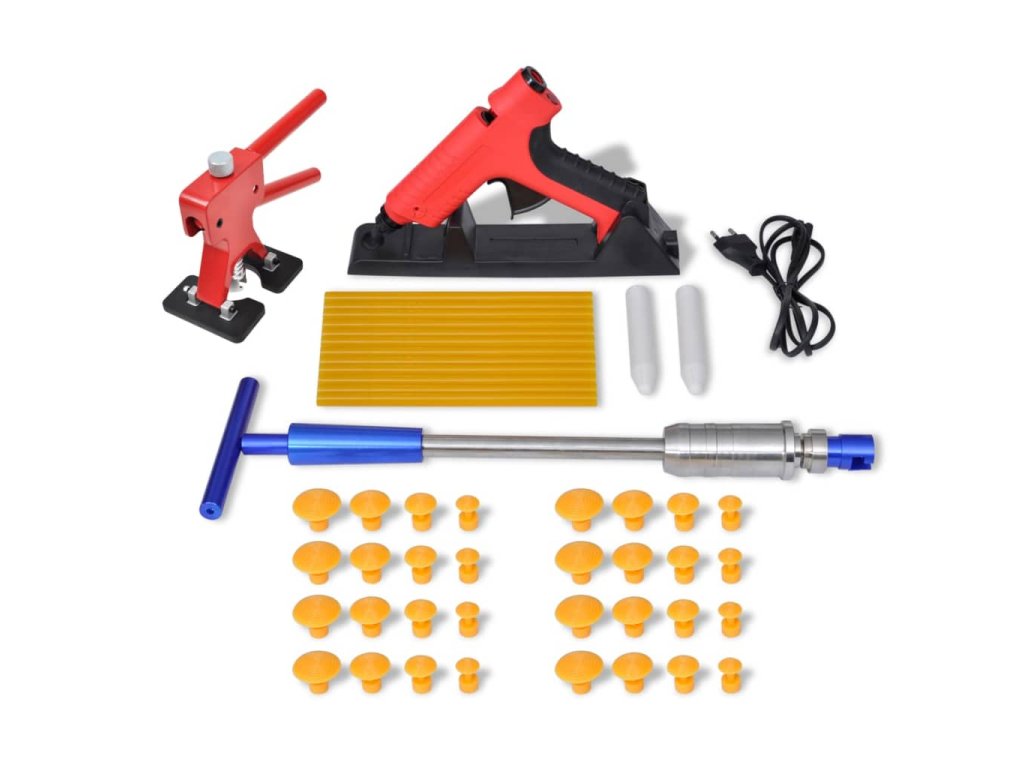 Táto sada na vyťahovanie preliačín je nevyhnutná pre akúkoľvek rodinu s autami, pretože má rozumnú cenu a viacúčelový dizajn. Obsahuje všetky potrebné nástroje, ktoré potrebujete odstrániť preliačin: 1 vyťahovák preliačín , 8 sád prísavky (celkom 32), 1 akumulátorová lepiaca pištoľ, 12 lepiace tyčinky, 2 drviace náradie a 1 kladivo. Táto sada opravy jamky v takmer každom mieste na každom vozidle. To šetrí peniaze a je ekonomická alternatíva k drahým profesionálom.