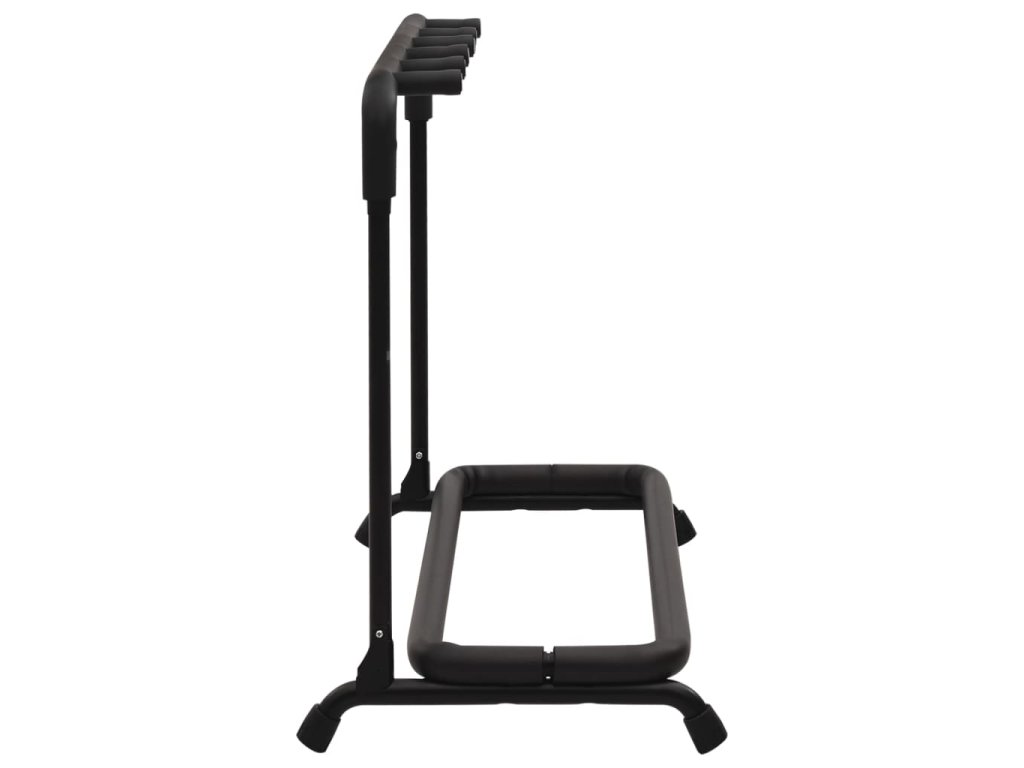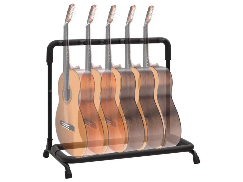 - 5 sekcií úložného priestoru: Gitarový stojan obsahuje 5 sekcií, takže môžete uložiť 5 gitár súčasne, aby ste ušetrili miesto. Dá sa na neho zavesiť väčšina modelov gitár, vrátane akustických gitár, elektrických gitár a basgitár.