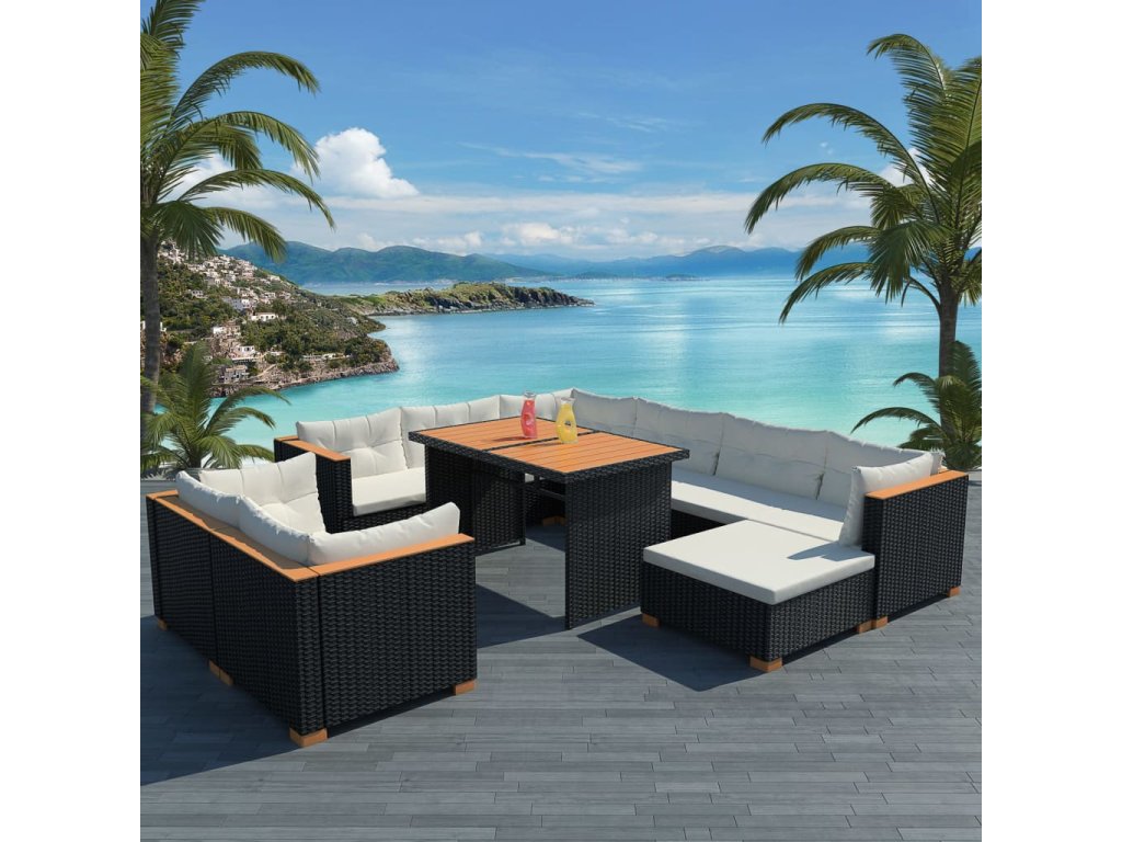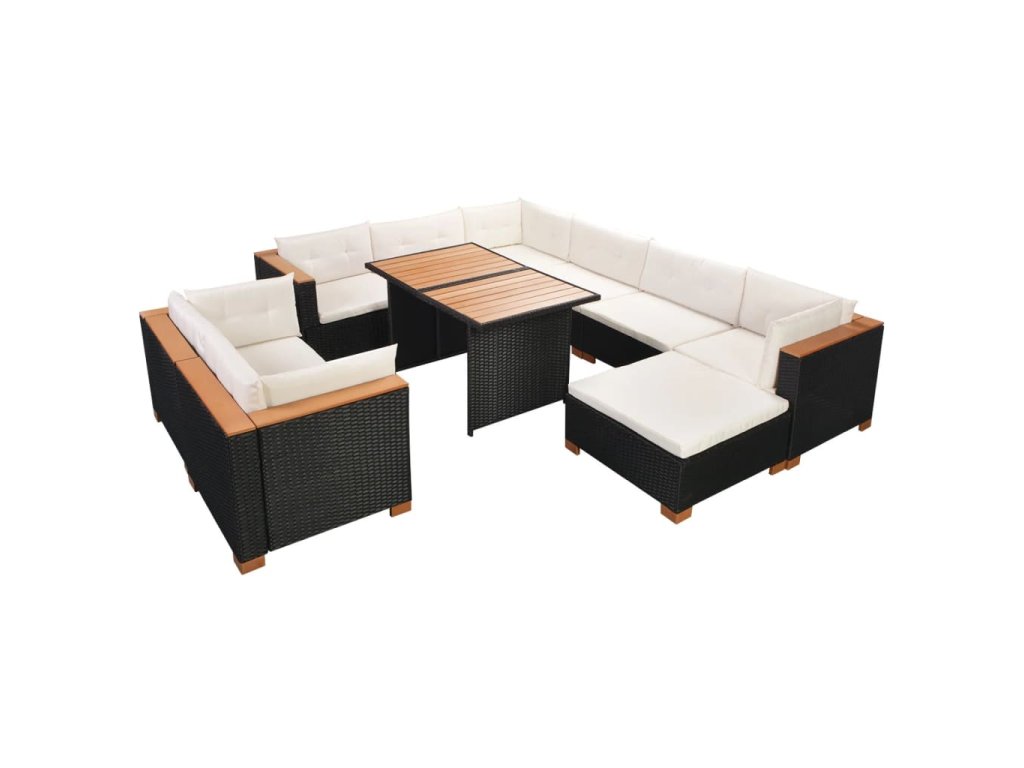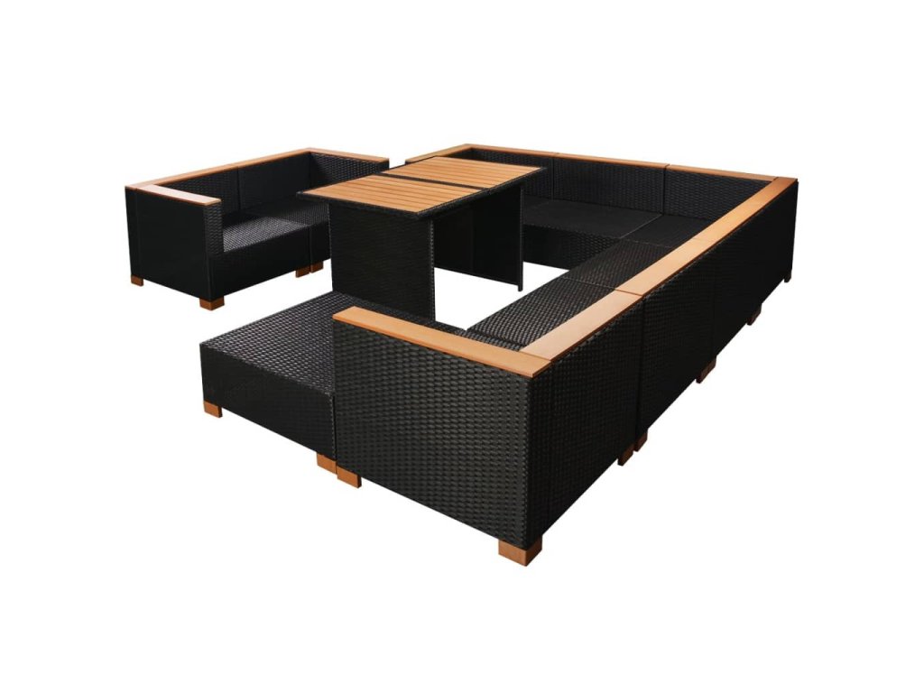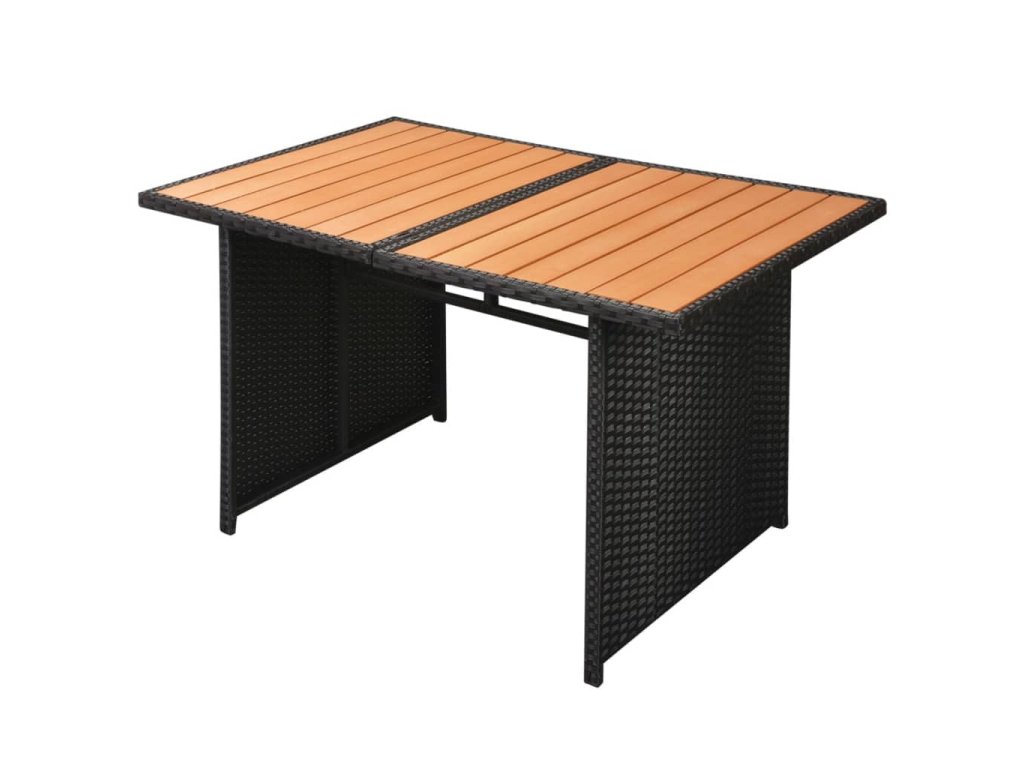 Odolná jedálenská súprava sa ľahko čistí a je vyrobená z PE ratanu, ktorý je odolný voči poveternostným vplyvom, a preto je vhodná na každodenné používanie v exteriéri. Jednotlivé sekcie pohovky majú pevný a trvácny oceľový rám s práškovou povrchovou úpravou. Odnímateľné podložky na sedadlo a vankúše sú veľmi pohodlné. Polyesterové poťahy si nevyžadujú náročnú údržbu a dajú sa zvliecť a oprať. Doska jedálenského stola a vrchná čas opierok na ruky sú vyrobené z trvácneho WPC hnedej farby. Ratanová súprava pohoviek pozostáva z oddelených modulov a preto sa dá jednoducho premiestňovať a prispôsobiť okolitému prostrediu.