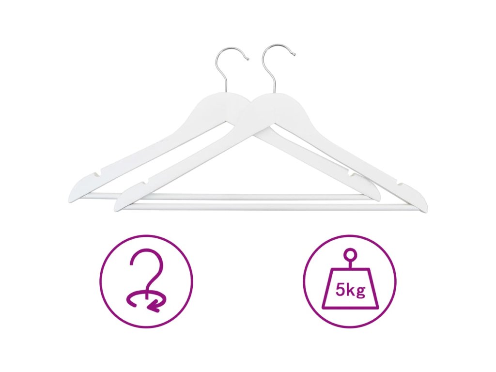 Táto sada drevených vešiakov je vyrobená z tvrdého dreva a kovu, vďaka čomu je dostatočne odolná a pevná, aby uniesla aj ťažšie veci. Háčik otočný o 360 stupňov poskytuje flexibilitu pri uložení vášho oblečenia na rôznych miestach. Dve drážky na oboch stranách zabraňujú skĺznutiu oblečenia alebo odevných doplnkov.
