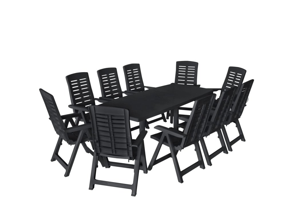Záhradná jedálenská súprava je vyrobená z odolného plastu, vďaka čomu sú stôl a stoličky odolné voči poveternostným vplyvom a ľahko sa čistia. Táto plastová jedálenská súprava je aj ľahká a jednoducho sa presúva. Záhradný stôl má otvor na slnečník, aby ste sa mohli schladiť v tieni. Operadlá majú 4 nastavenia sklonu, takže si môžete vždy nájsť tú najpohodlnejšiu pozíciu. Keď sa stoličky nepoužívajú, dajú sa sklopiť, aby sa ušetrilo miesto.