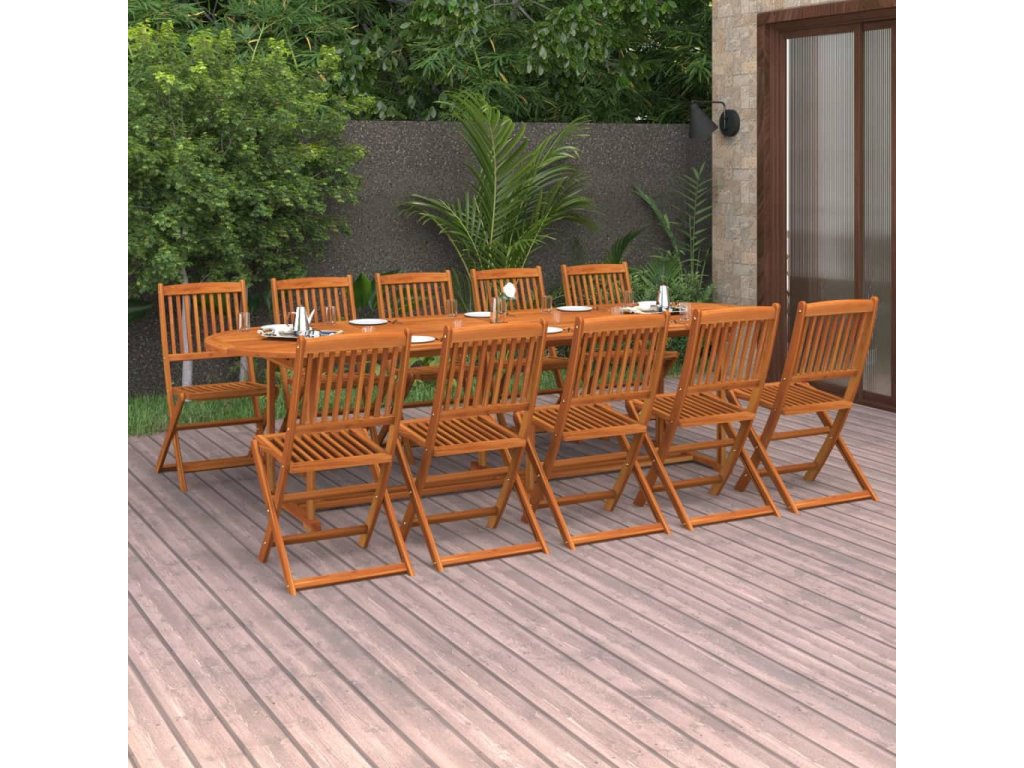 Vonkajšia jedálenská súprava je vyrobená z akáciového masívu, tropického tvrdého dreva, ktoré je trvácne a odolné voči poveternostným vplyvom, a tak vám vydrží dlhé roky. Povrch s olejovým náterom sa dá ľahko očistiť navlhčenou handričkou. Stoličky na terasu sa navyše dajú poskladať do kompaktných rozmerov, aby nezaberali veľa miesta, keď ich nepoužívate.