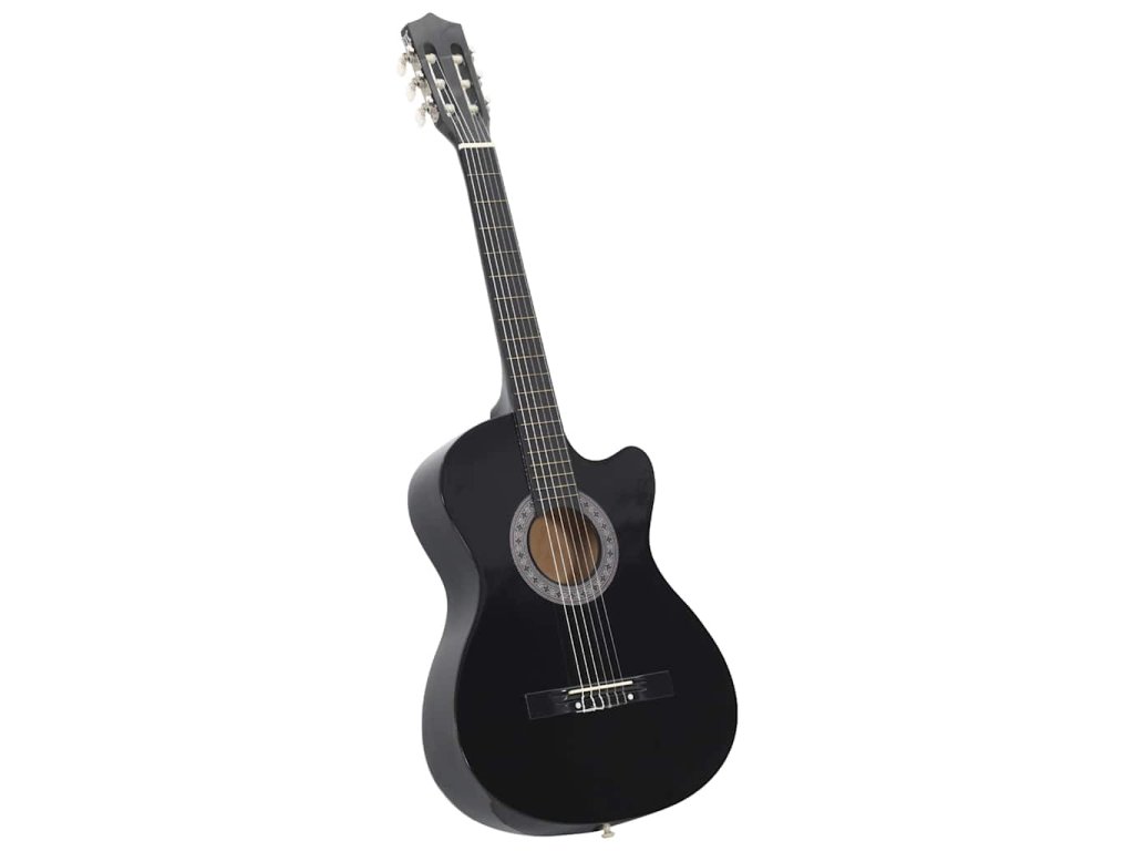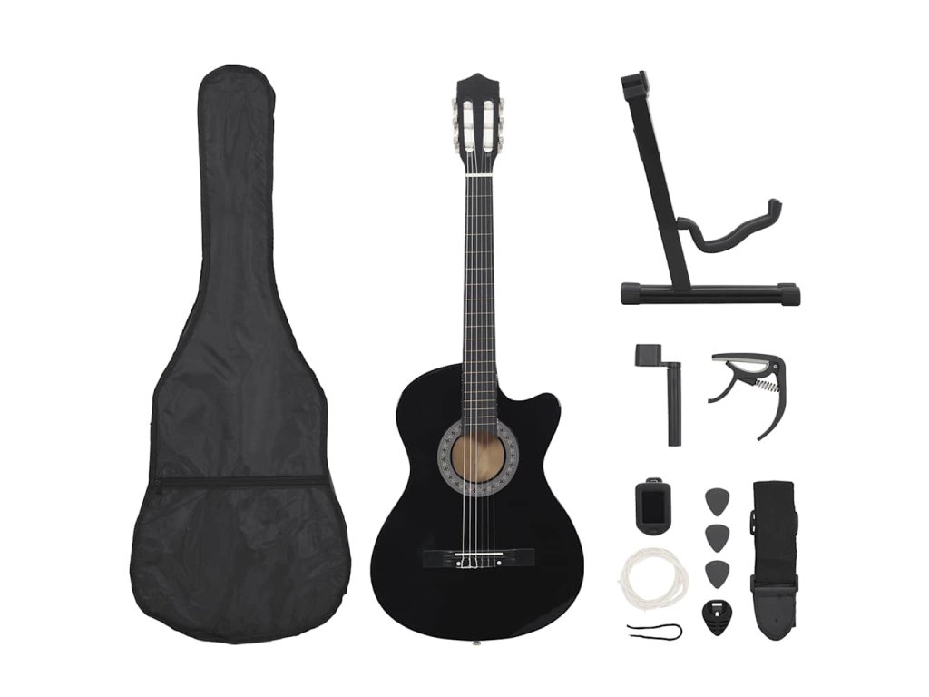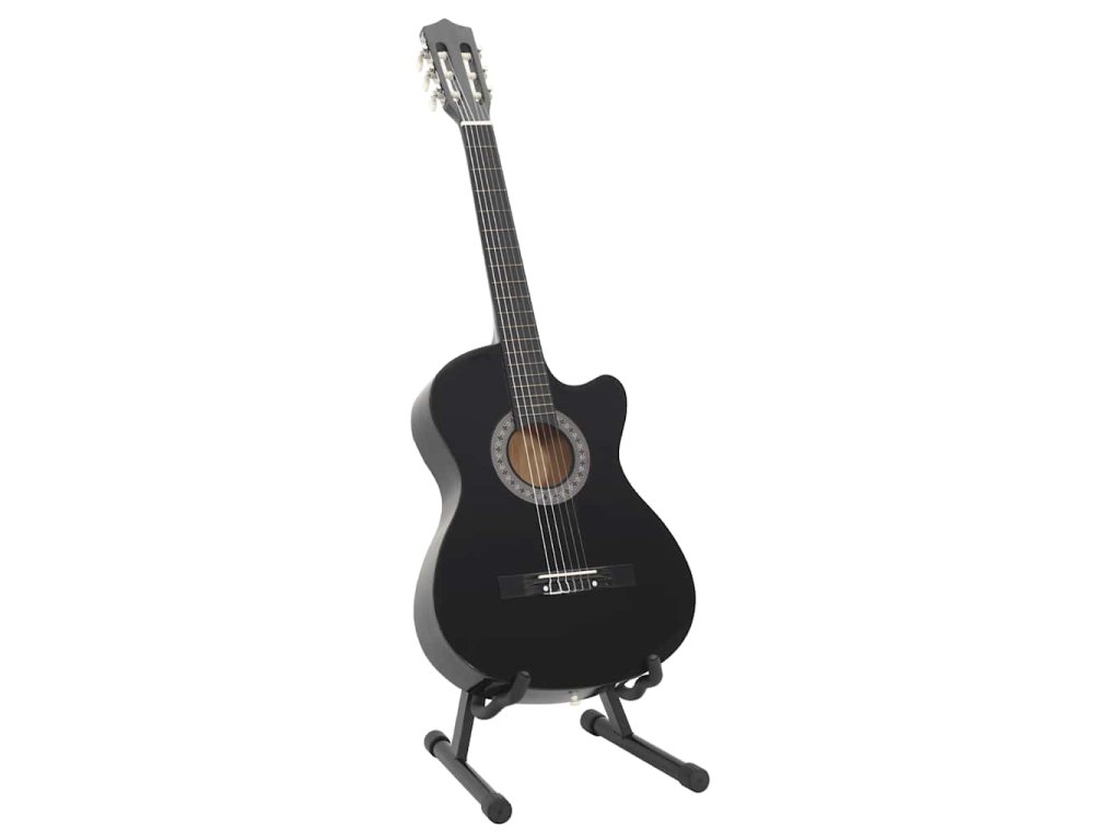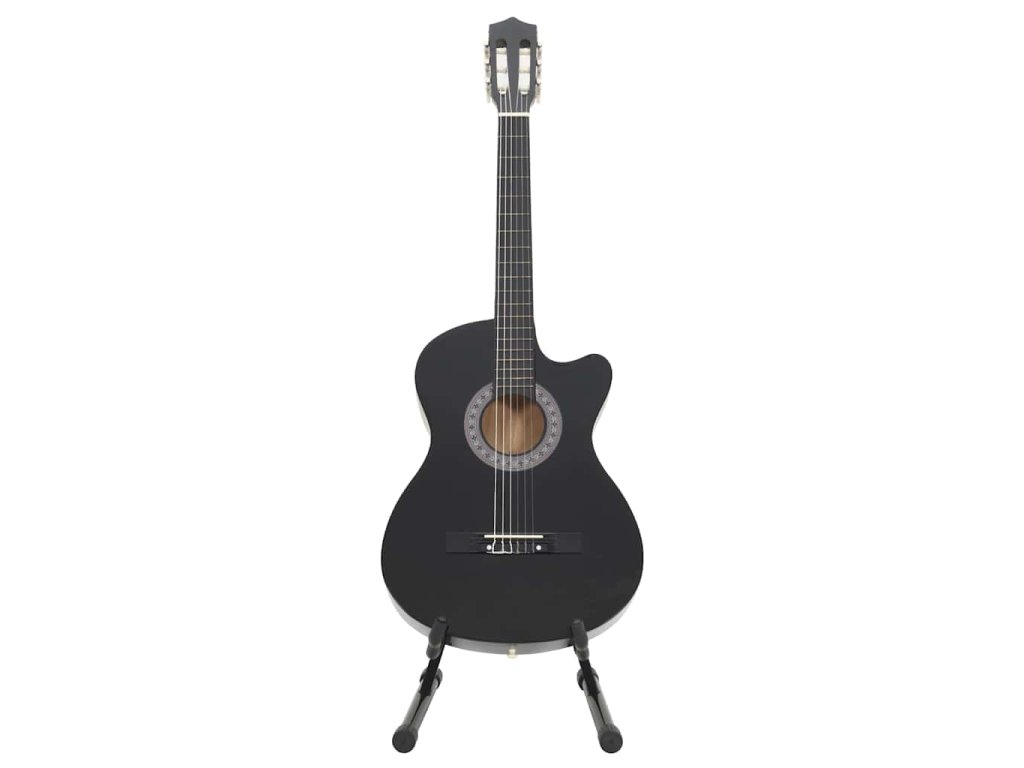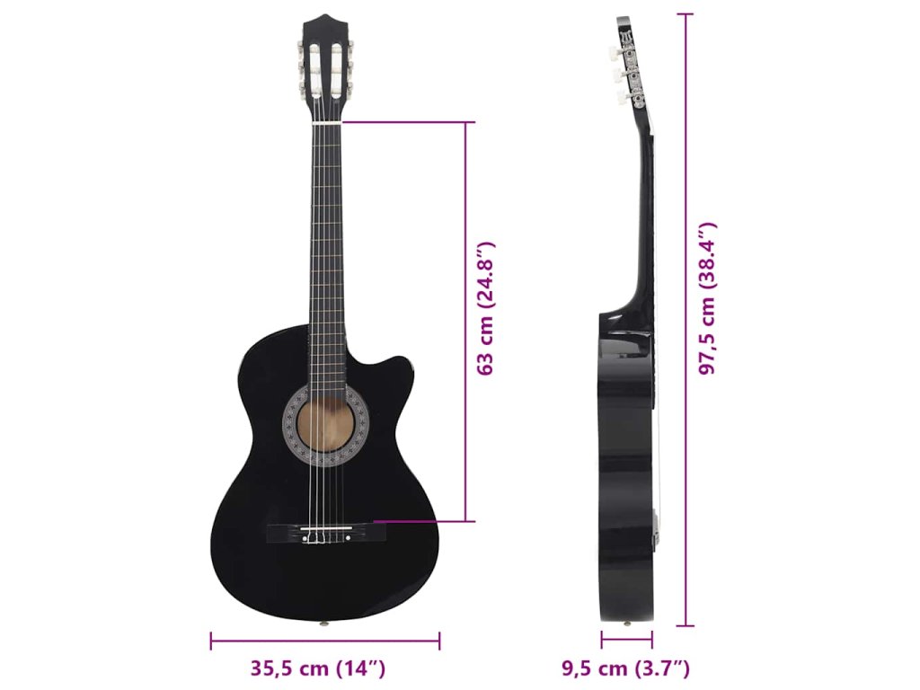 Naša folková gitara cutaway je skvelý nástroj pre začiatočníkov, amatérov a hudobníkov akejkoľvek úrovne. V balení je okrem gitary aj taška na gitaru, popruh, trsátka, držiak na trsátka, sada gitarových strún, kľuka na struny, kapodaster, elektrická ladička a držiak na gitaru.
