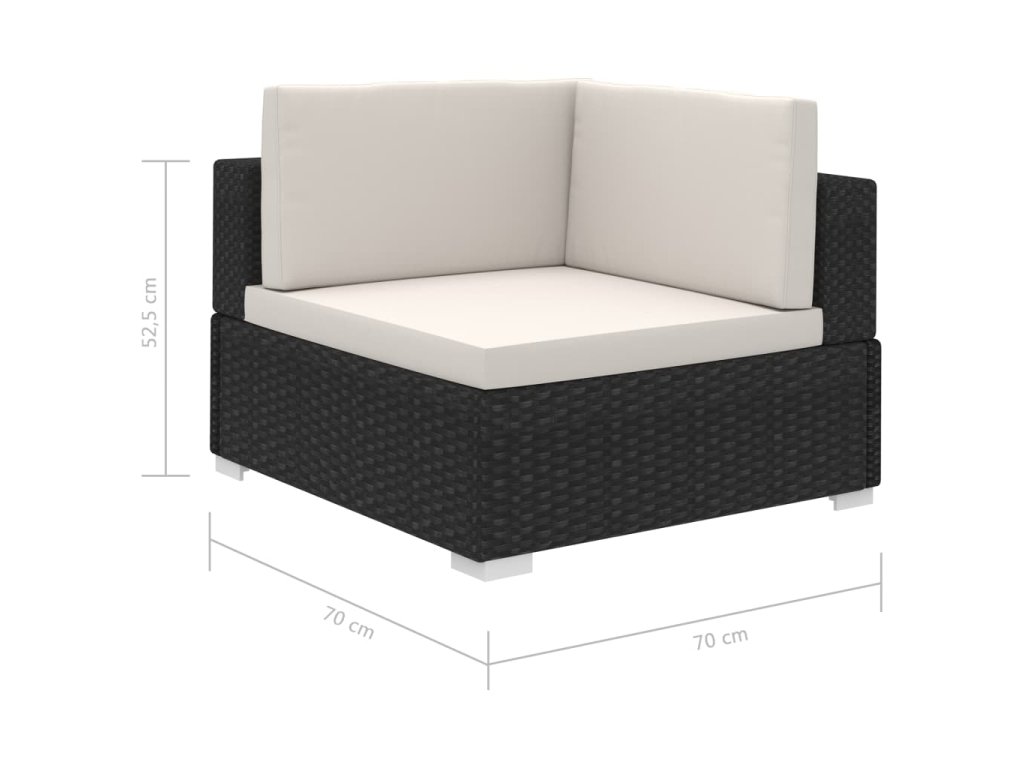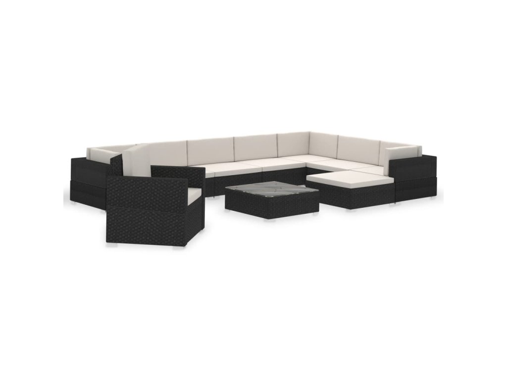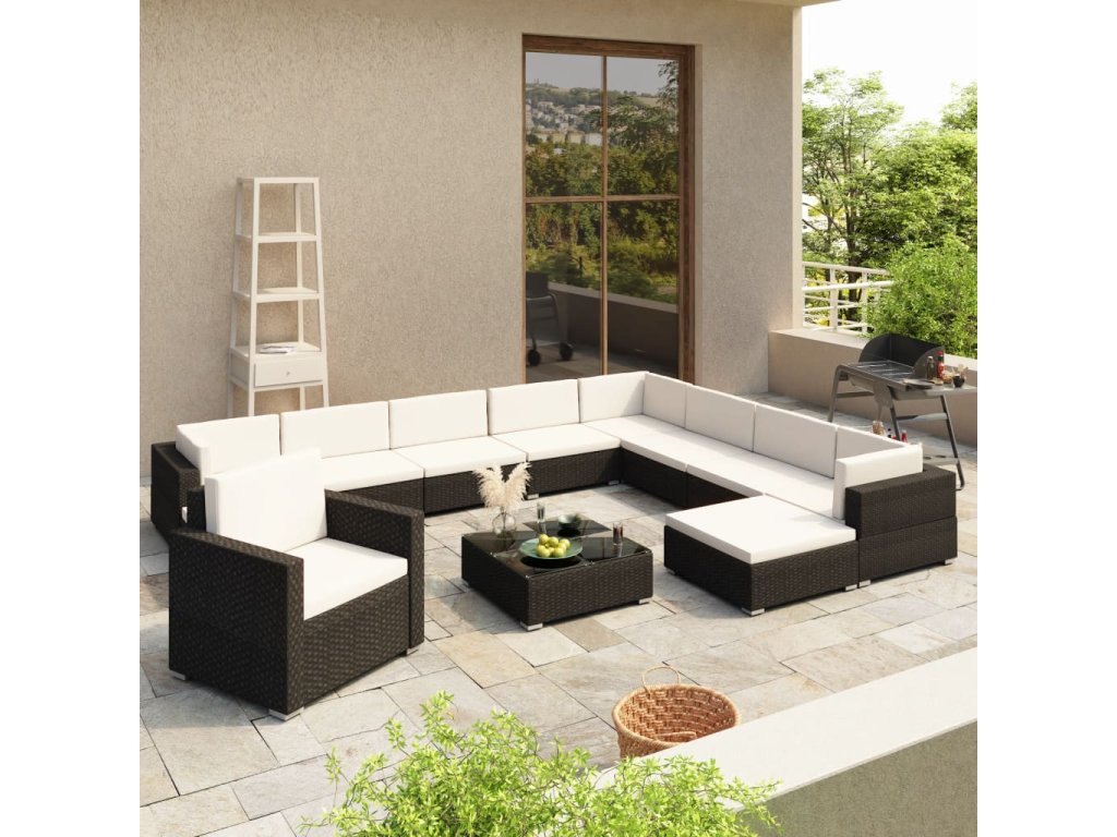 V balení sa nachádza 1 x kreslo, 3 x rohové kreslo, 5 x kreslo bez opierok na ruky, 2 x taburetka, 1 x konferenčný stolík so sklenenou doskou, 11 x čalúnená podložka na sedadlo a 12 x čalúnená podložka na operadlo.