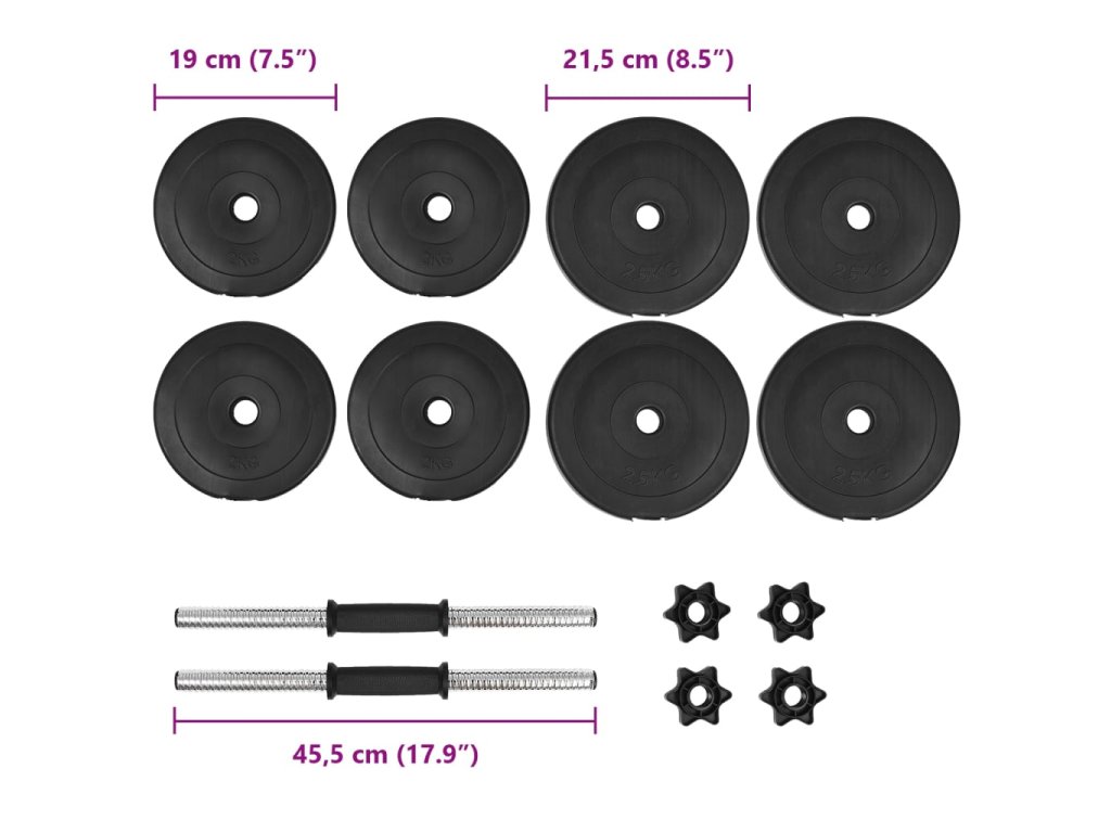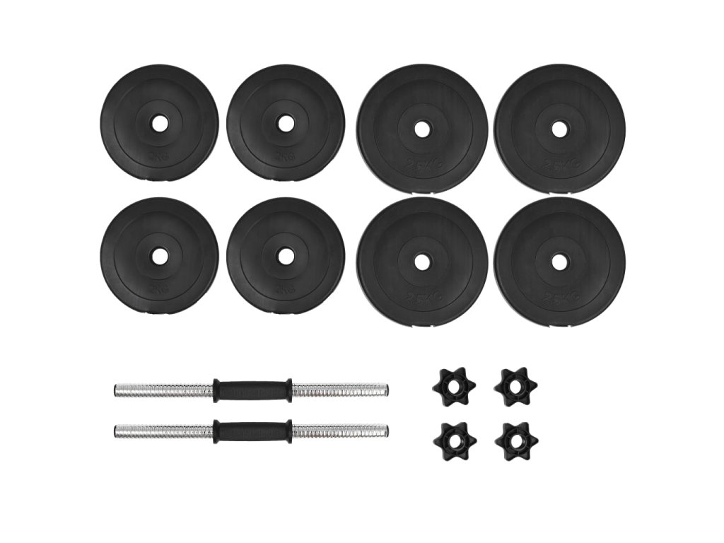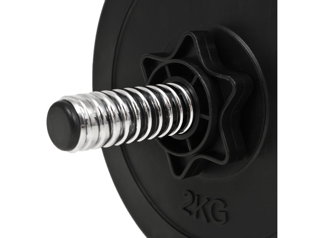 - Premyslený dizajn: Pre rýchlu a jednoduchú identifikáciu je hmotnosť zreteľne vyrazená na každom závaží. Činkové tyče majú protišmykový plastový úchop.