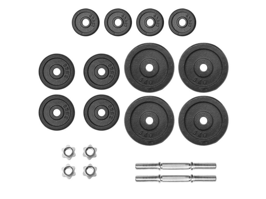 Táto všestranná sada činiek je ideálna na precvičovania hrudníka, bicepsov, ramien, tricepsov a chrbtových svalov. Obsahuje štyri závažia s hmotnosťou 5 kg, štyri závažia s hmotnosťou 2,25 kg, štyri závažia s hmotnosťou 1,25 kg a dve činkové tyče s hmotnosťou 2,25 kg. Celková hmotnosť je približne 40 kg. Táto sada umožňuje používateľom variabilne voliť hmotnosti, ktoré chcú zdvíhať pri rôznych cvičeniach.