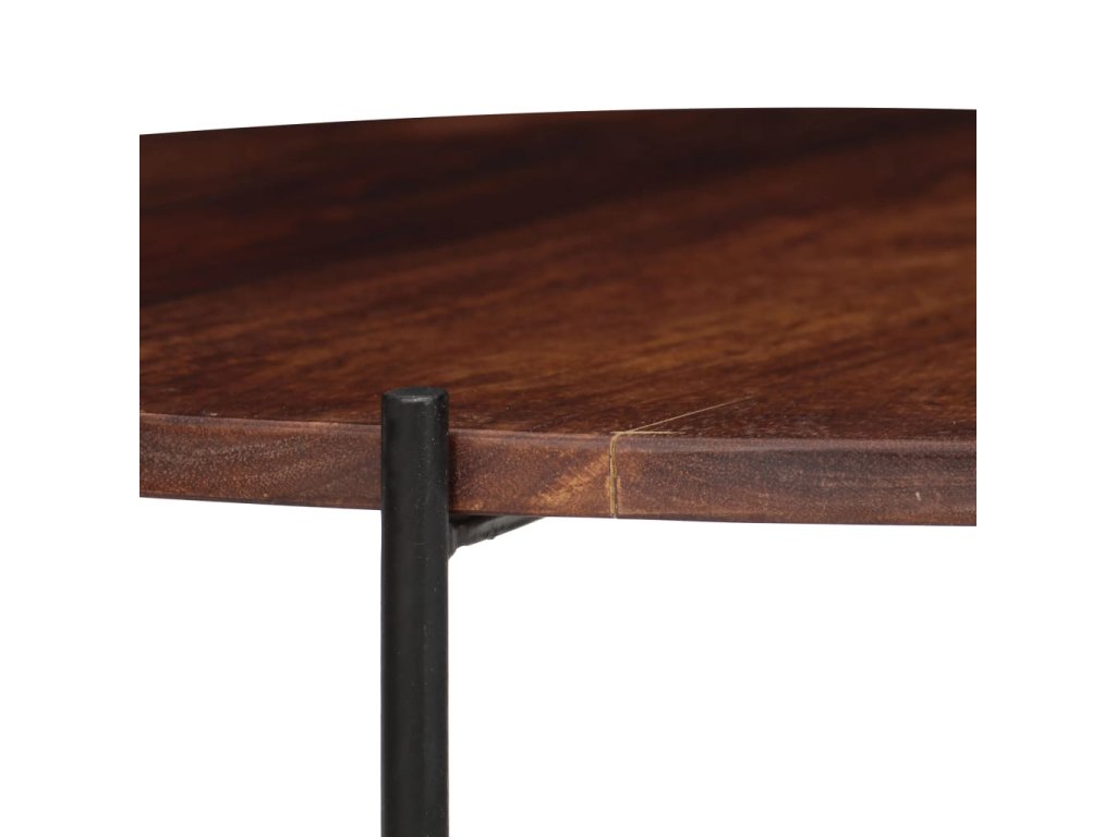 Vrchná doska z masívneho akáciového dreva poskytuje stabilný povrch, na ktorý môžete umiestniť nápoje, ovocné koše, vázy alebo iné dekoratívne predmety. Akácia je tropické tvrdé drevo, ktoré je známe svojou bohatou štruktúrou a je známe aj ako ružové drevo alebo palisander. Pevné oceľové nohy zabezpečujú robustnú konštrukciu, ale aj priemyselný vzhľad. Vďaka remeselnému spracovaniu a krásnej štruktúre dreva je každý kus nábytku jedinečný a trochu odlišný od ostatných kusov. Aby sa ušetril priestor, dá sa menší stolík zasunúť pod väčší.
