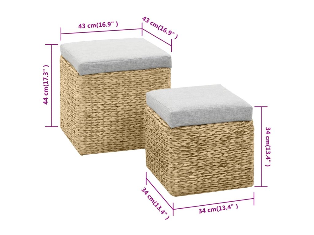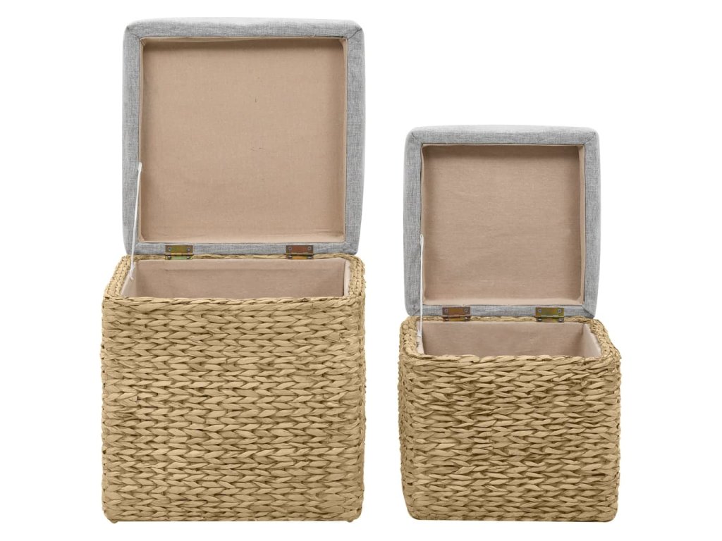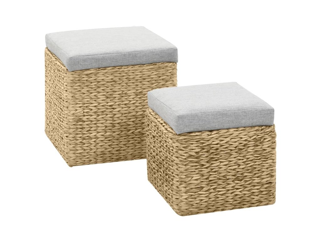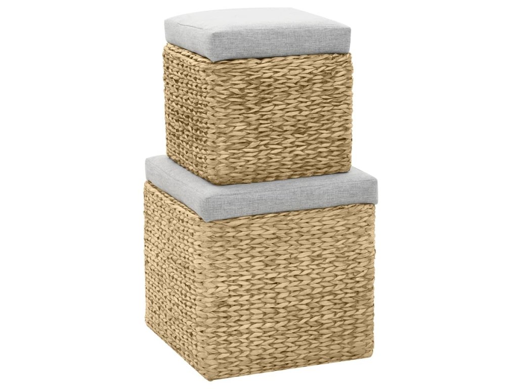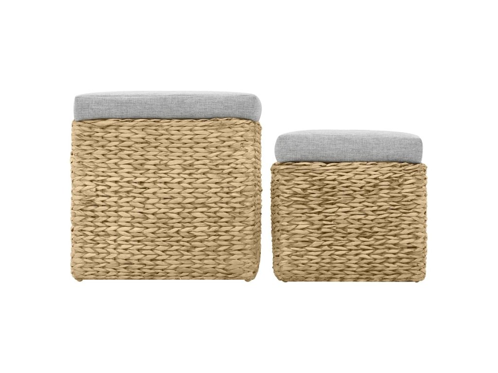 Taburetky sú vyrobené z morskej trávy a dodajú akejkoľvek miestnosti rustikálny a prírodný nádych. Sada ponúka dostatok úložného priestoru na úhľadné uloženie rôznych vecí, ktoré potrebujete mať na dosah ruky. Sedák zvyšuje pohodlie počas sedenia. Sada je už zostavená a žiadna dodatočná montáž nie je potrebná.