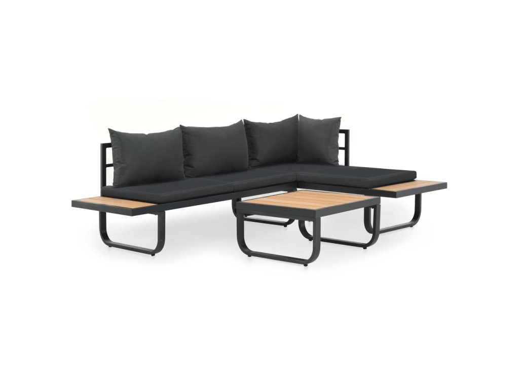 Sedacia súprava je vyrobená z hliníka a WPC (drevoplastového kompozitu), vďaka čomu je trvácna a odolná voči poveternostným vplyvom, a preto je ideálna do exteriéru. Podložky na sedadlo a vankúše, ktoré sú súčasťou balenia, sa postarajú o optimálny komfort pri sedení, a tak sa táto sedacia súprava stane dokonalým miestom na oddychovanie. Sedacia súprava sa jednoducho montuje.