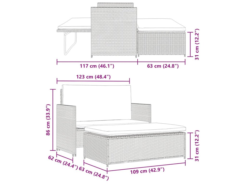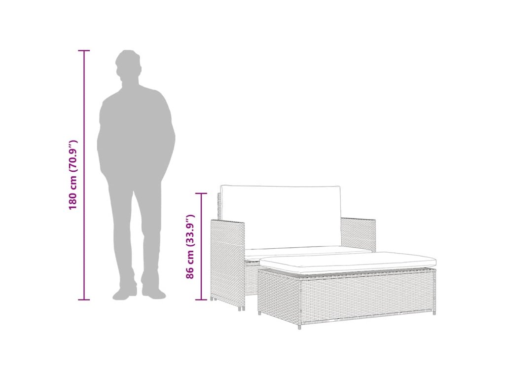 Vďaka PE ratanu odolnému voči poveternostným vplyvom sa táto sada lehátok ľahko čistí, je odolná a vhodná pre každodenné používanie. Táto sada má pevný oceľový rám s práškovaným povrchom, ktorý je veľmi odolný. Je ľahká a modulárna, takže je flexibilná a ľahko sa presúva, aby zapadla do akéhokoľvek prostredia. Ľahko môžete premeniť pohovku na posteľ sklopením operadla nadol. Potom si môžete prisunúť podnožku a pohodlne si zdriemnuť. Budete môcť relaxovať v príjemnom komforte a štýle počas celého leta, bez ohľadu na príležitosť. Ak sedadlo nepoužívate, môžete ho uložiť pod pohovku, aby ste ušetrili priestor. Táto sada je dodávaná s veľmi pohodlnými, hrubo polstrovanými sedákmi a zadným vankúšom. Obliečky z polyesteru sa jednoduchou udržiavajú a môžete ich zvliecť a oprať. Balenie obsahuje dvojmiestnu pohovku, sedačku a tri vankúše.