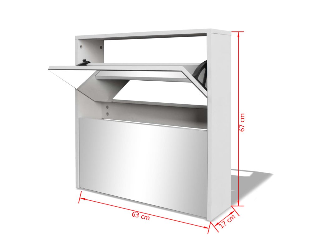 Botník so zrkadlom má dve poličky. Do každej môžete vložiť 3 až 4 páry topánok a dá sa namontovať priamo na stenu. Táto silná a trvácna skrinka je vyrobená z vysoko kvalitného materiálu. Bude slúžiť ako veľmi praktický kus nábytku pre elegantné a štýlové uskladnenie obuvi.