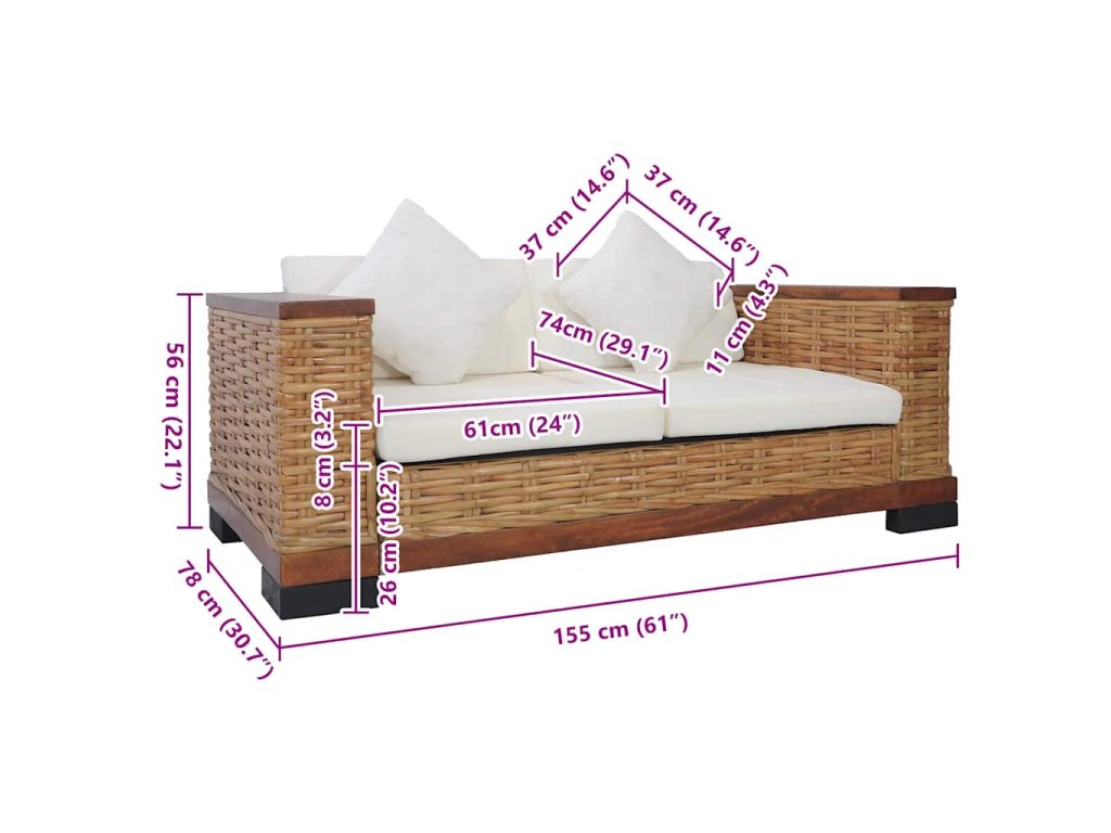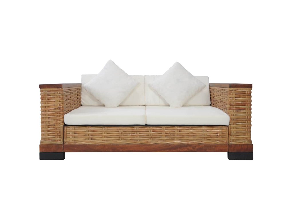 Vďaka materiálu z pravého ratanu sa pohovka jednoducho čistí, je odolná a vhodná na každodenné použitie. Má pevný drevený rám, ktorý je skutočne trvácny a stabilný. Hrubé podsedáky a vankúše sú veľmi pohodlné a vďaka odnímateľným návliečkam sú aj umývateľné. Široké lakťové opierky zaručujú pohodlné sedenie.