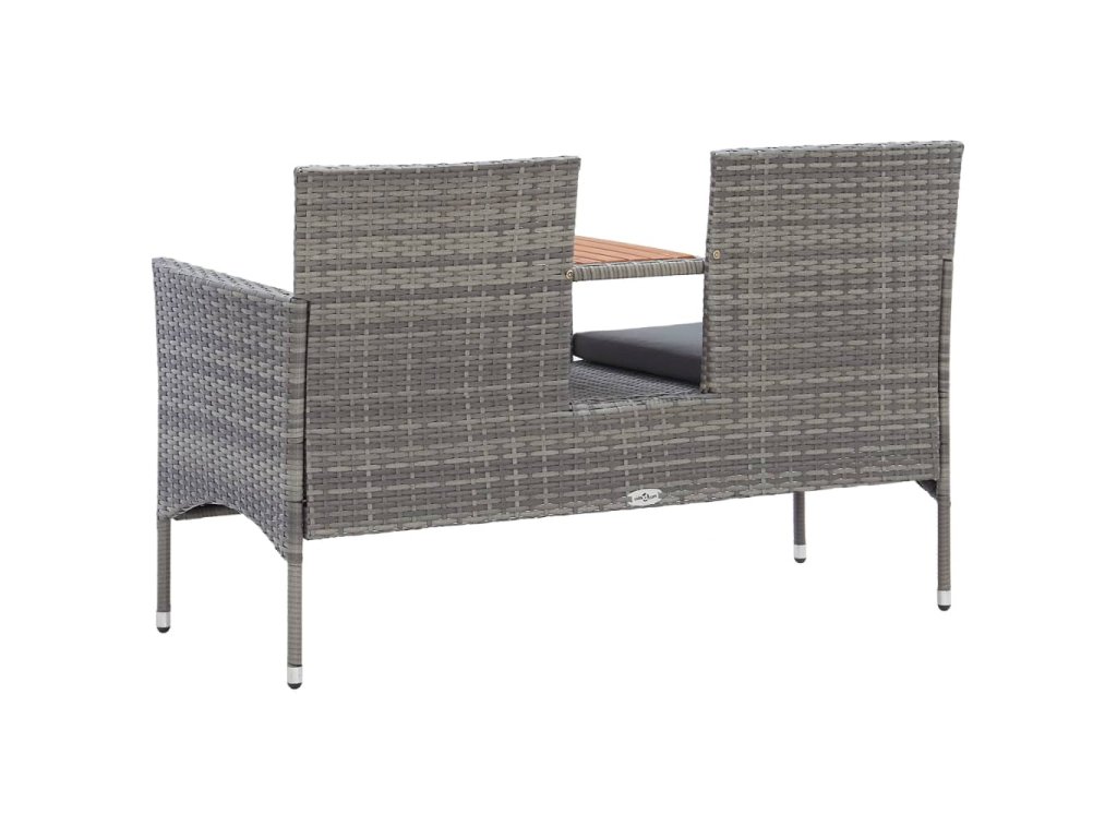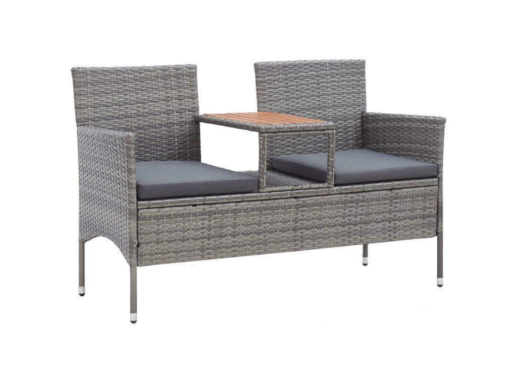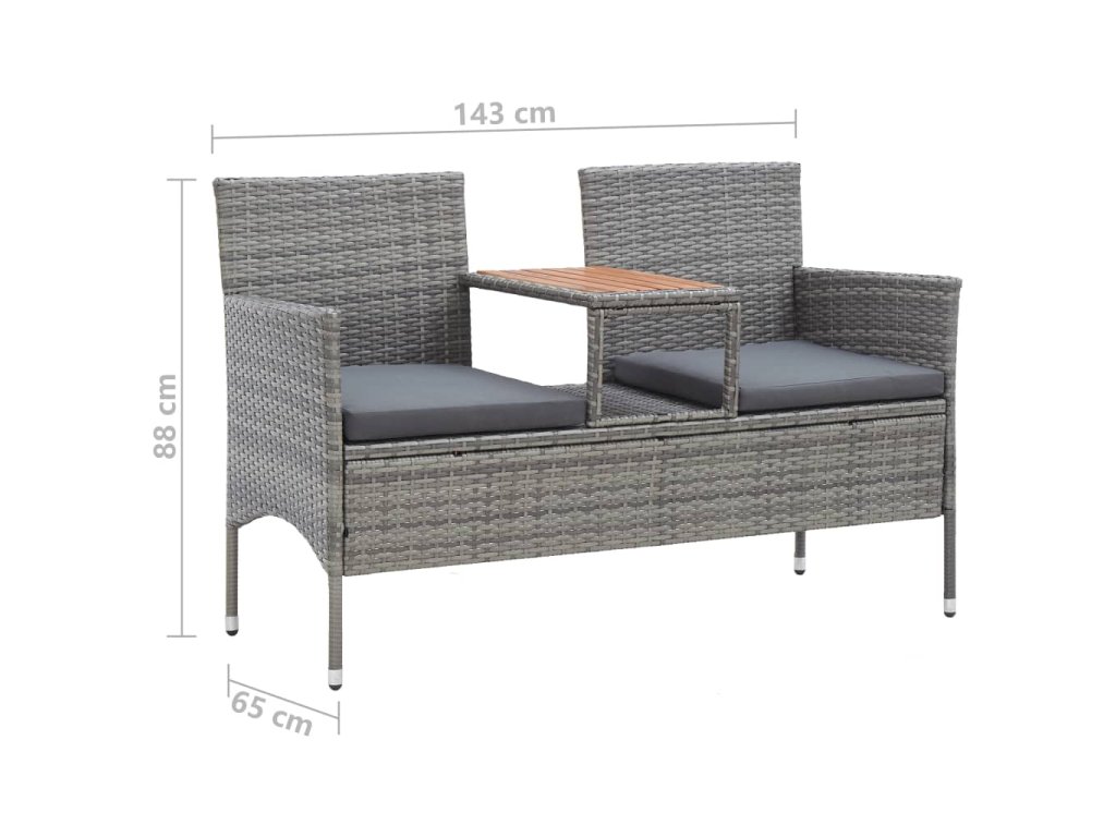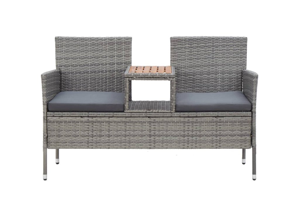 Súprava je vyrobená z PE ratanu, čo je vodovzdorný materiál, ktorý je odolný voči poveternostným vplyvom. Takže sa dá súprava ľahko očistiť, je trvácna a vhodná aj na každodenné používanie. Lavička má pevný oceľový rám s práškovou povrchovou úpravou. Je ľahká, a preto ju môžete bez problémov presunúť, kam potrebujete. Dve sedadlá sú spojené čajovým stolíkom, na ktorý si môžete odložiť nápoje či obľúbené knižky, aby ste ich mali vždy poruke. Hrubé odnímateľné vankúše sú veľmi pohodlné. Ľahko sa čistiace polyesterové poťahy so skrytými zipsmi je možné zvliecť a vyprať.
