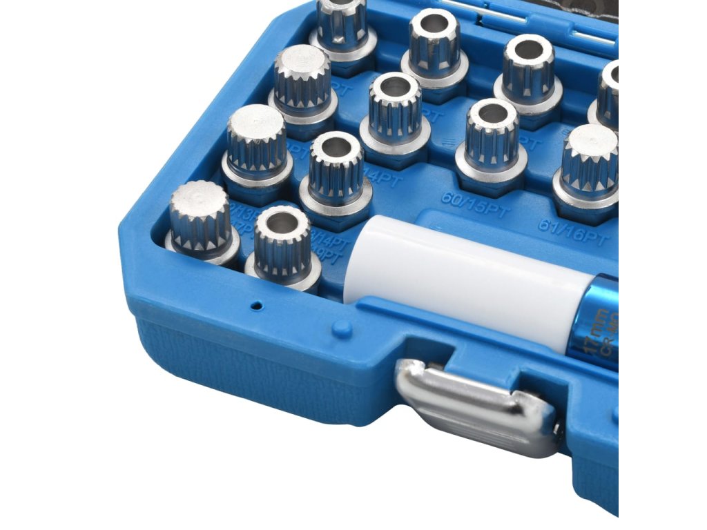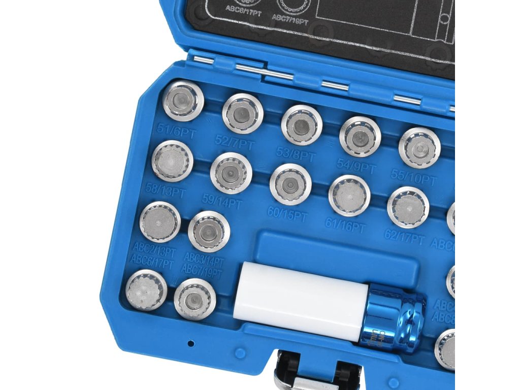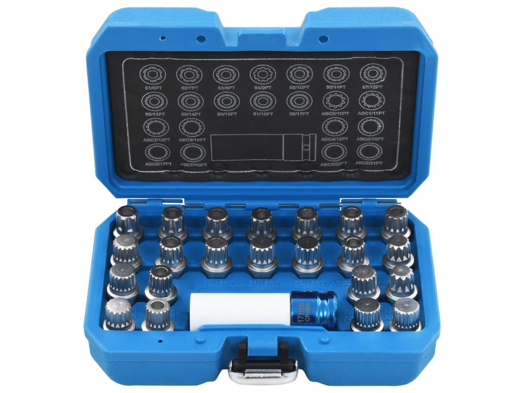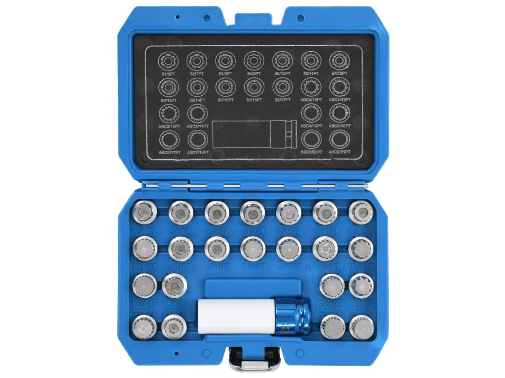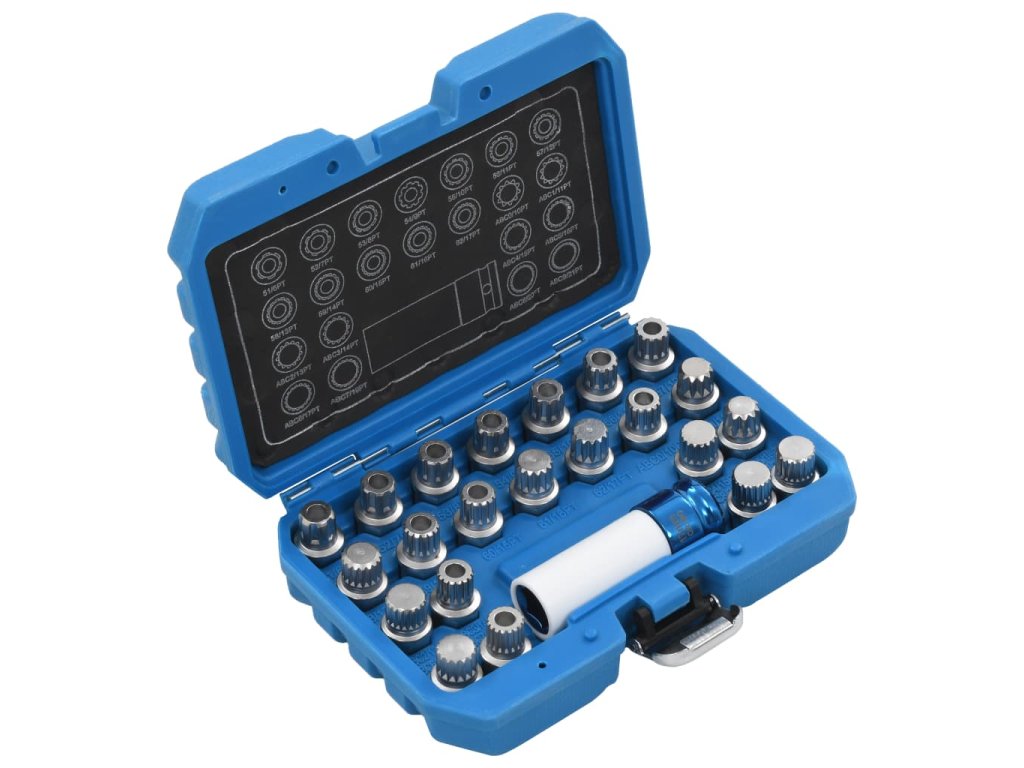 Táto 23-dielna sada náradia na bezpečnostné skrutky kolies obsahuje 22 demontážnych kľúčov v rôznych veľkostiach a 1 ochranný nárazový kľúč. Je určená na demontáž alebo inštaláciu matíc ráfika na väčšine vozidiel VAG.