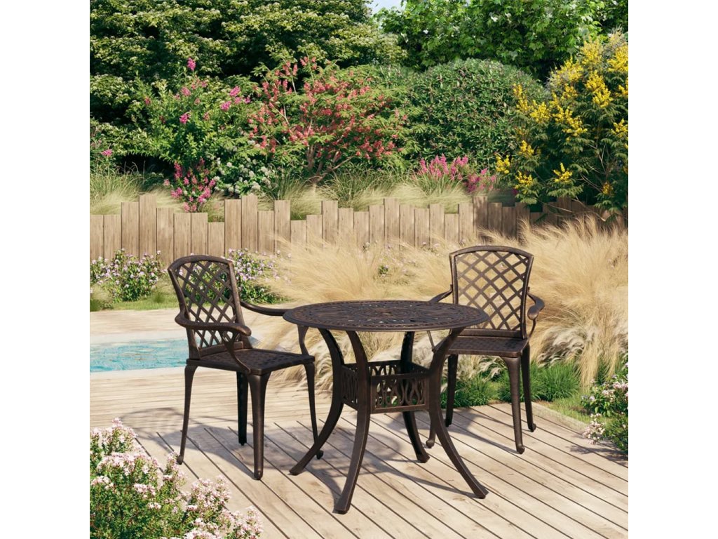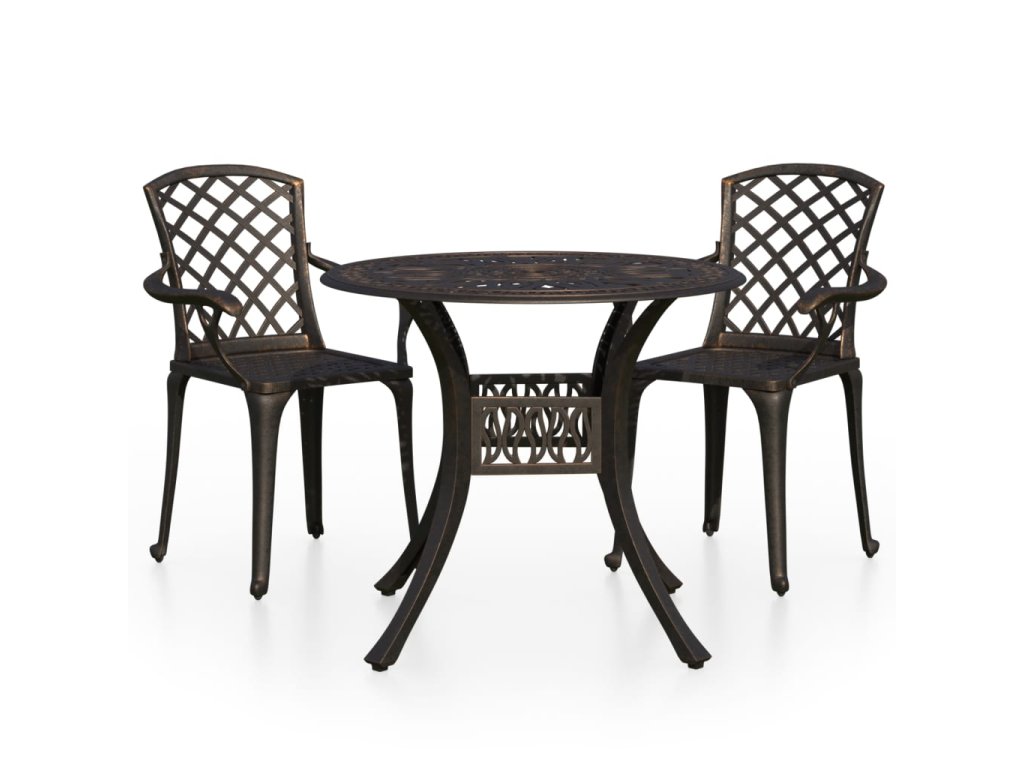 Vonkajšie stoličky a stôl sú vyrobené z liateho hliníka, a sú robustné a odolné. Vďaka materiálu odolnému voči hrdzi a poveternostným vplyvom je nábytková zostava ideálna na vonkajšie použitie. Vďaka nádherným vzorom je bistro sada elegantným doplnkom vášho vonkajšiemu priestoru. Konferenčný stolík má navyše otvor na slnečník, ktorý ochráni vás pred slnkom alebo dažďom.