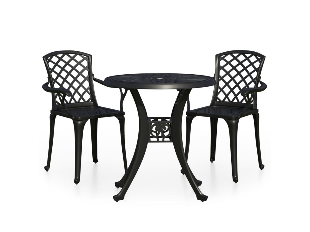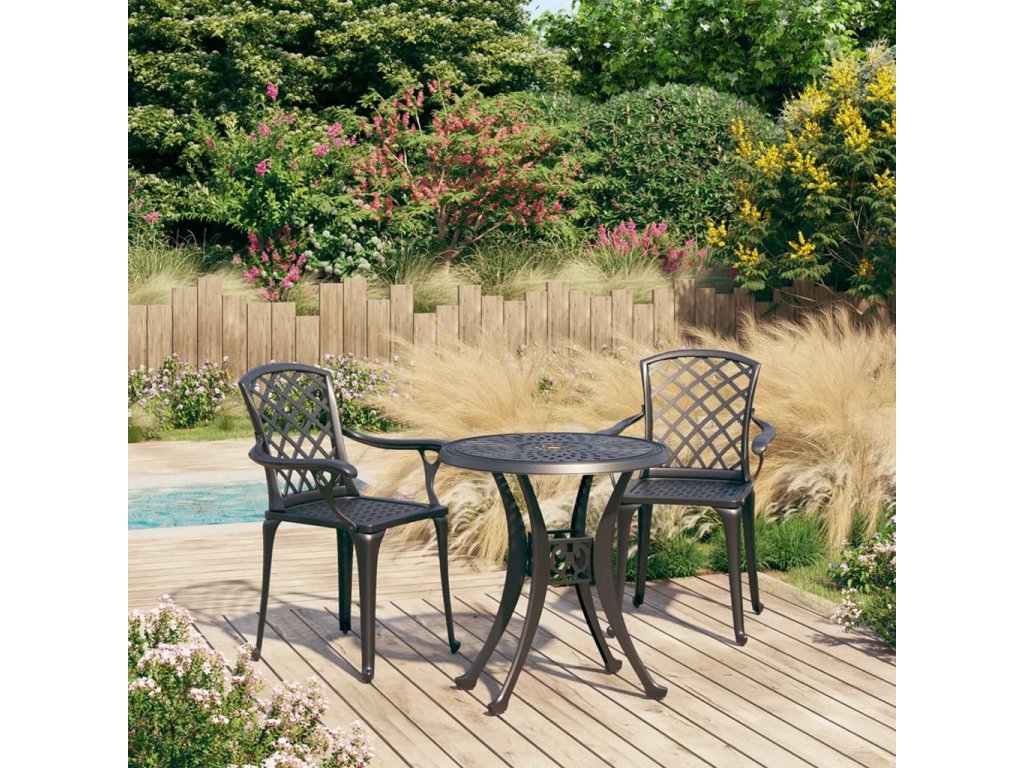 Vonkajšie stoličky a stôl sú vyrobené z liateho hliníka, a sú robustné a odolné. Vďaka materiálu odolnému voči hrdzi a poveternostným vplyvom je nábytková zostava ideálna na vonkajšie použitie. Vďaka nádherným vzorom je bistro sada elegantným doplnkom vášho vonkajšiemu priestoru. Konferenčný stolík má navyše otvor na slnečník, ktorý ochráni vás pred slnkom alebo dažďom.