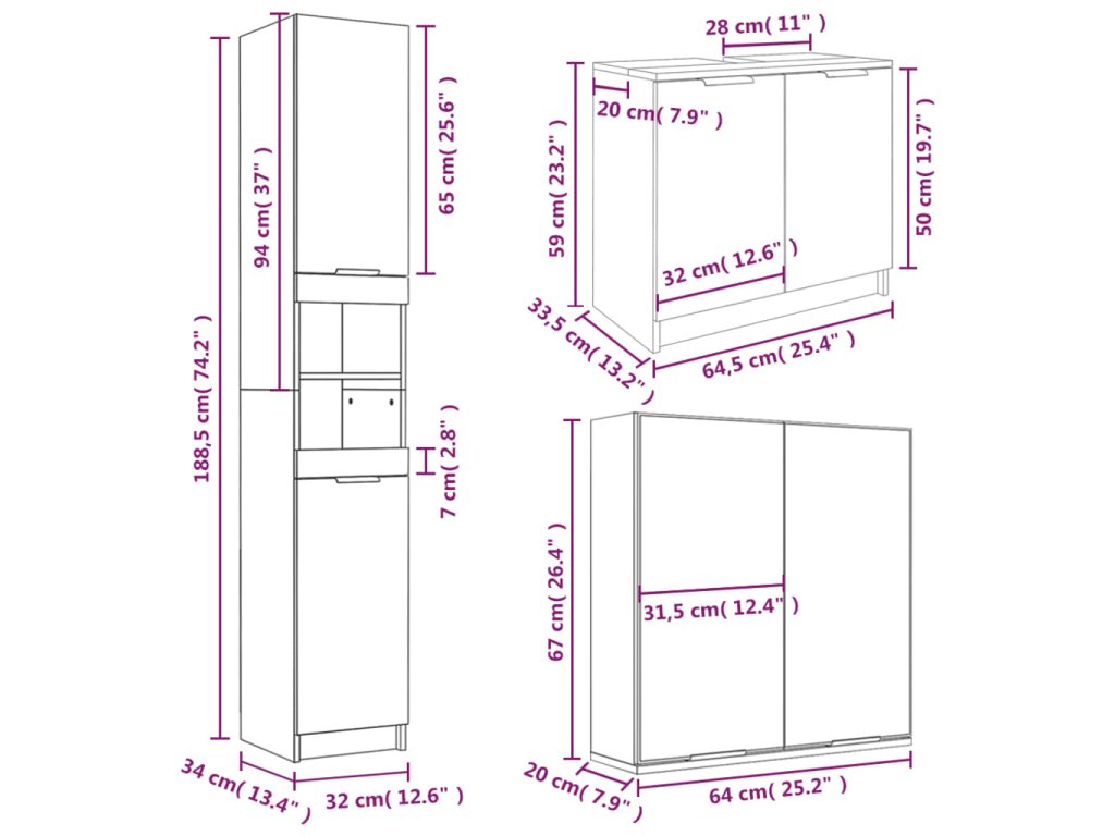 - Rozmery prízemnej skrinky (l): 32 x 34 x 188,5 cm (D x Š x V)