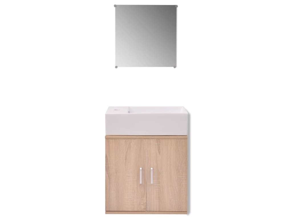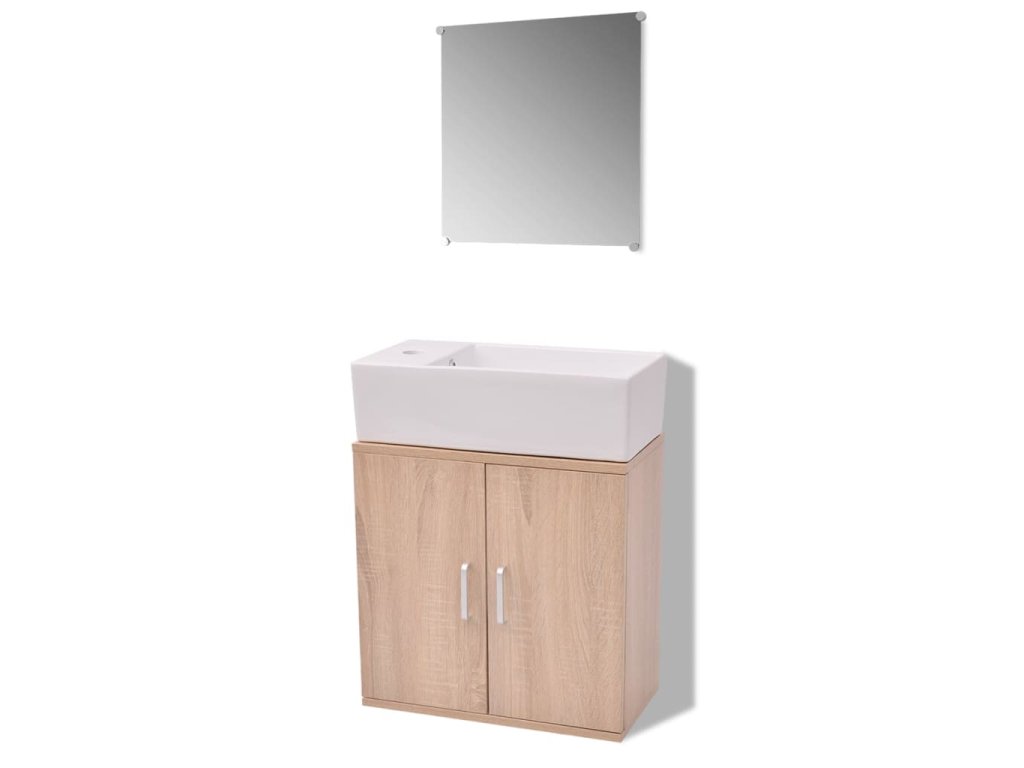 Súčasťou tejto modernej súpravy kúpeľňového nábytku je zrkadlo a skrinka pod umývadlo. Skrinka pod umývadlo poskytuje množstvo priestoru na odkladanie toaletných a kozmetických potrieb či iných drobností. Toaletná skrinka je vyrobená z vysokokvalitného kompozitného dreva, čo zaručuje jej pevnosť a trvácnosť.