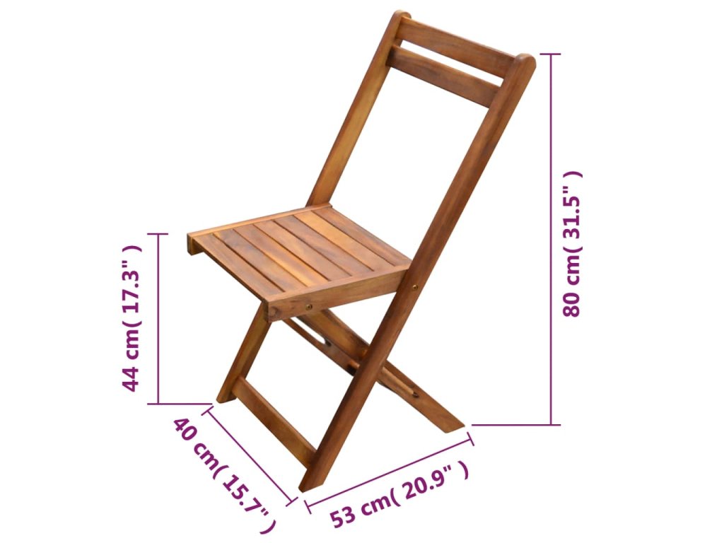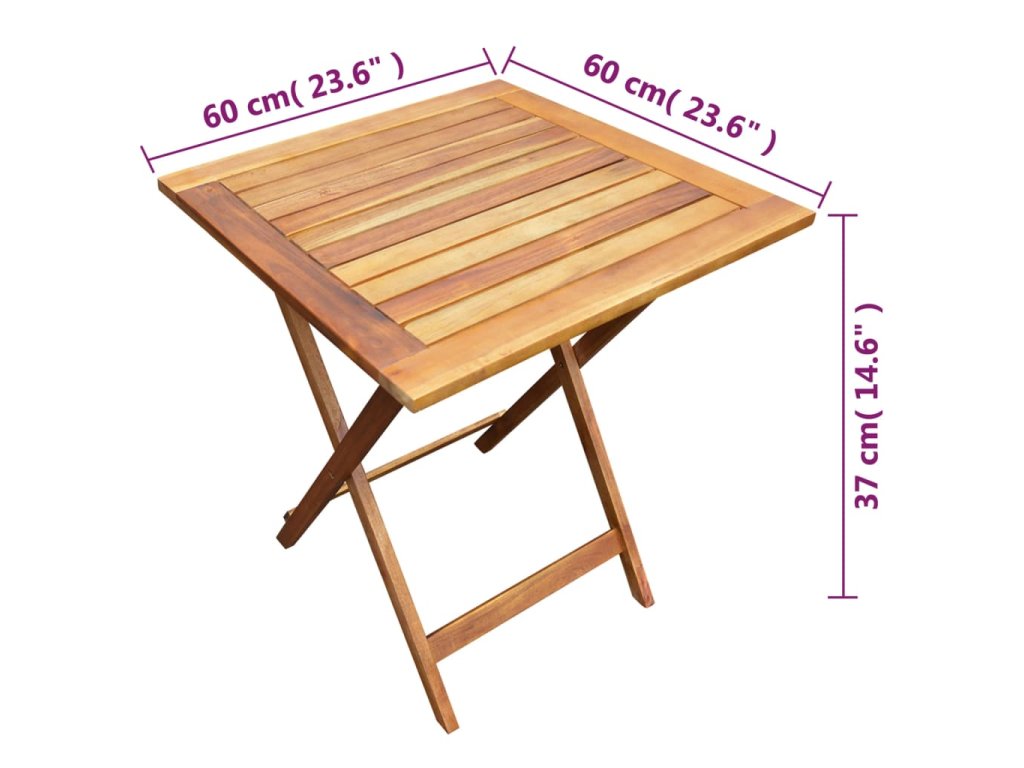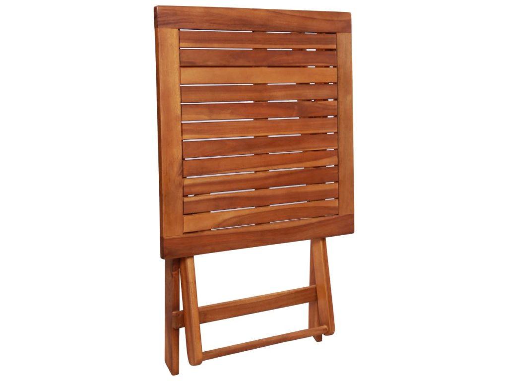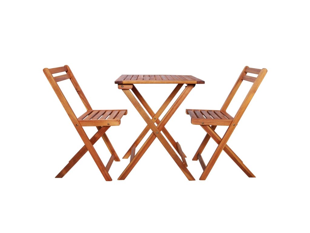 Tento záhradný nábytok je vyrobený z pevného masívneho akáciového dreva, ktoré je odolné voči vplyvom počasia. Drevo má olejovú povrchovú úpravu, vďaka čomu má táto súprava teplú farbu. Stôl a stoličky sa dajú zložiť pre ľahké skladovanie a prepravu. Montáž je jednoduchá.