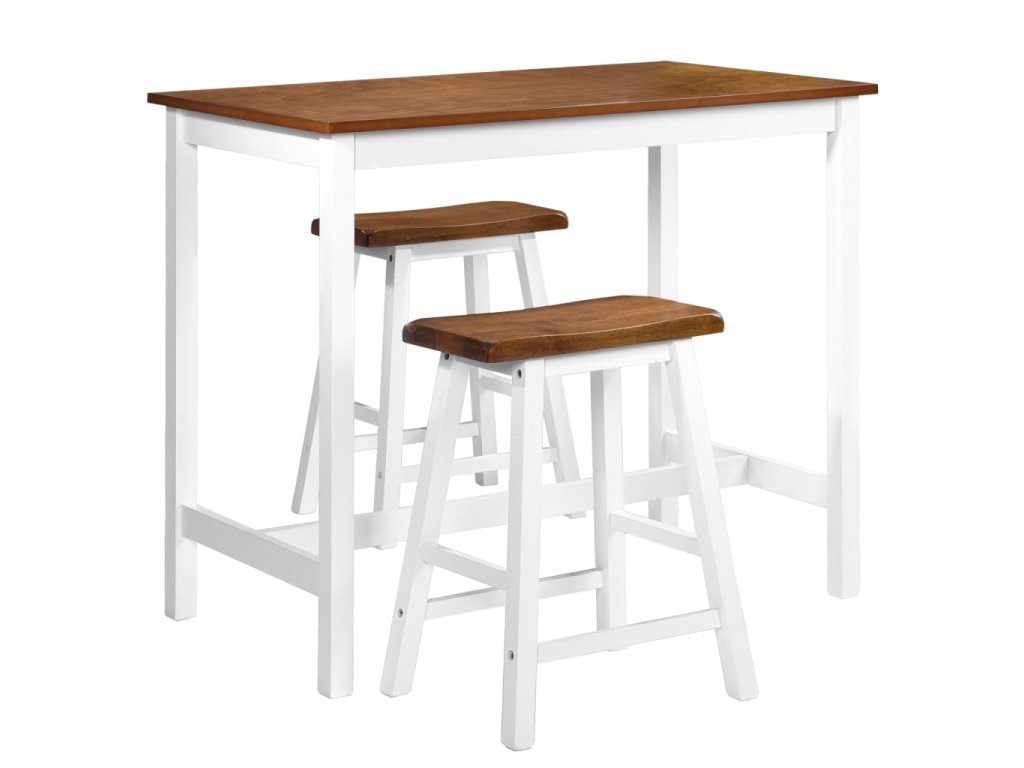 Tento barový stôl má stolovú dosku vyrobenú z MDF a pevné drevené nohy. Stoličky sú kompletne vyrobené z masívneho dreva, vďaka čomu sú pevné a trvácne. Táto barová súprava dostala krásnu povrchovú úpravu brúsením, maľovaním a lakovaním, aby získala rafinovaný vzhľad. Stôl a stoličky sa ľahko čistia vlhkou handričkou. Montáž je jednoduchá.