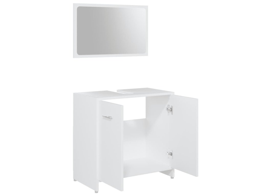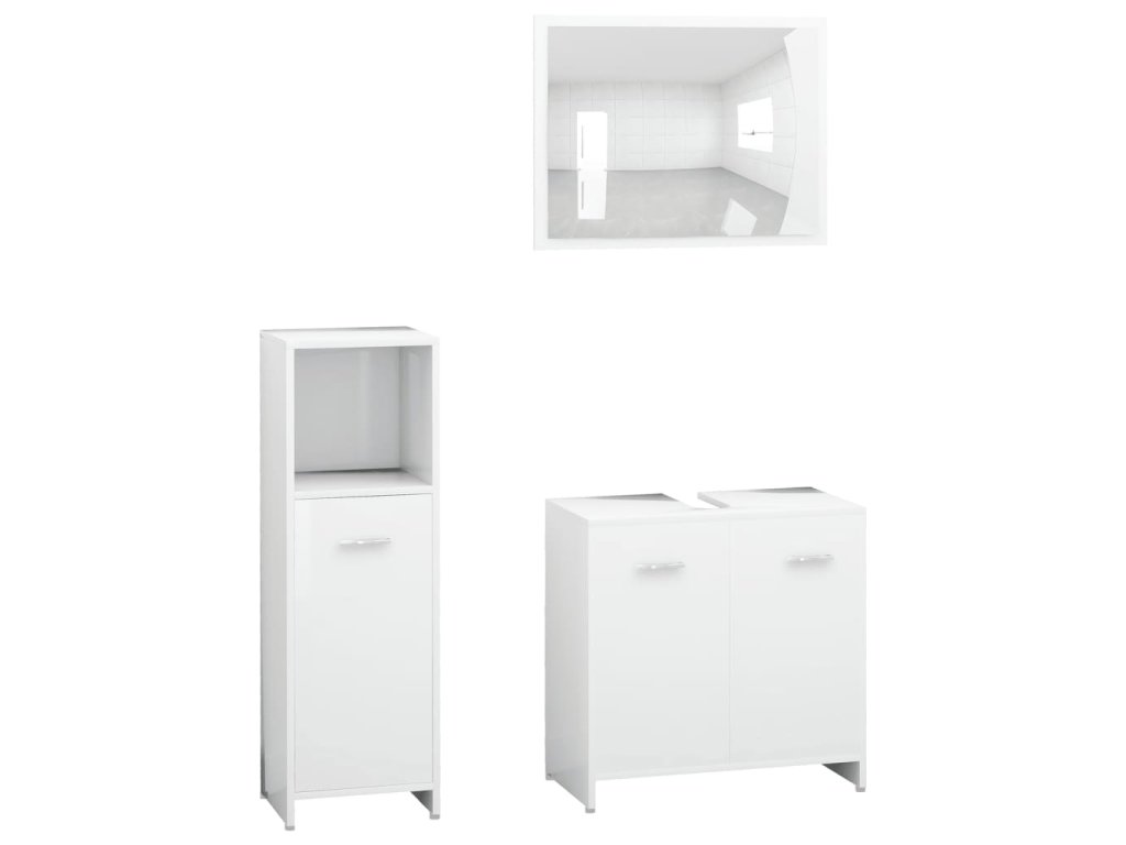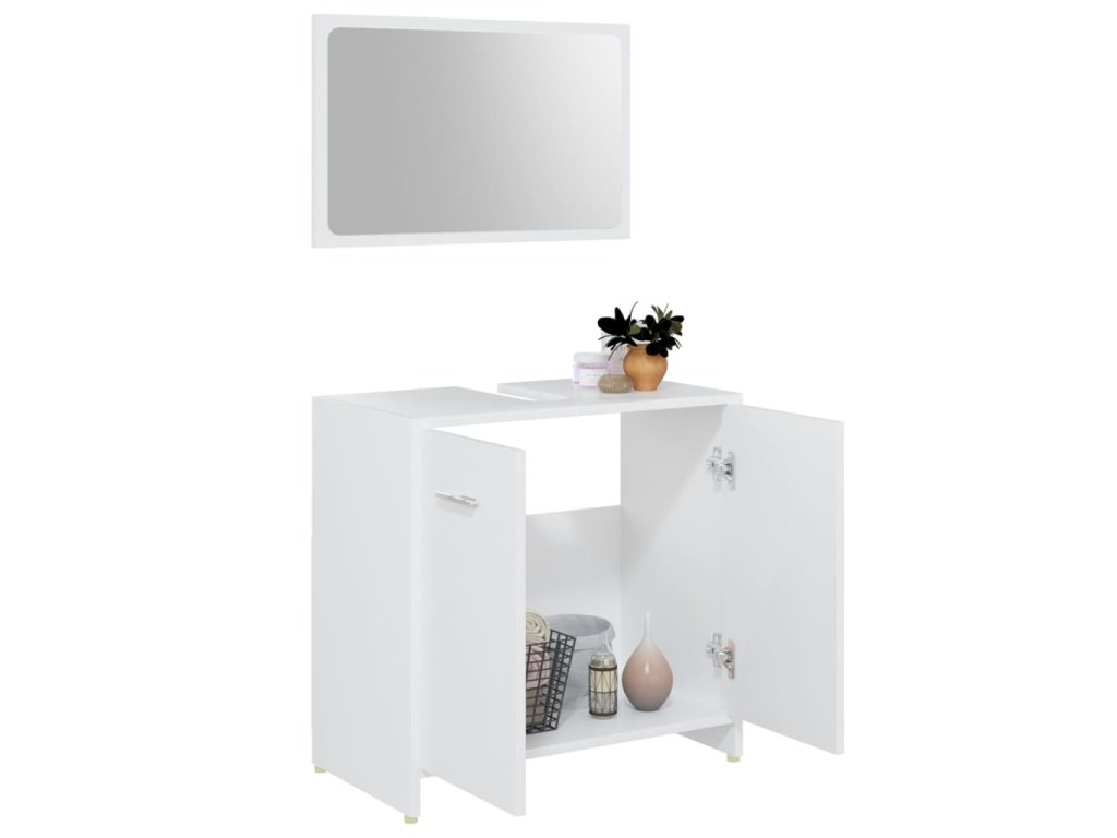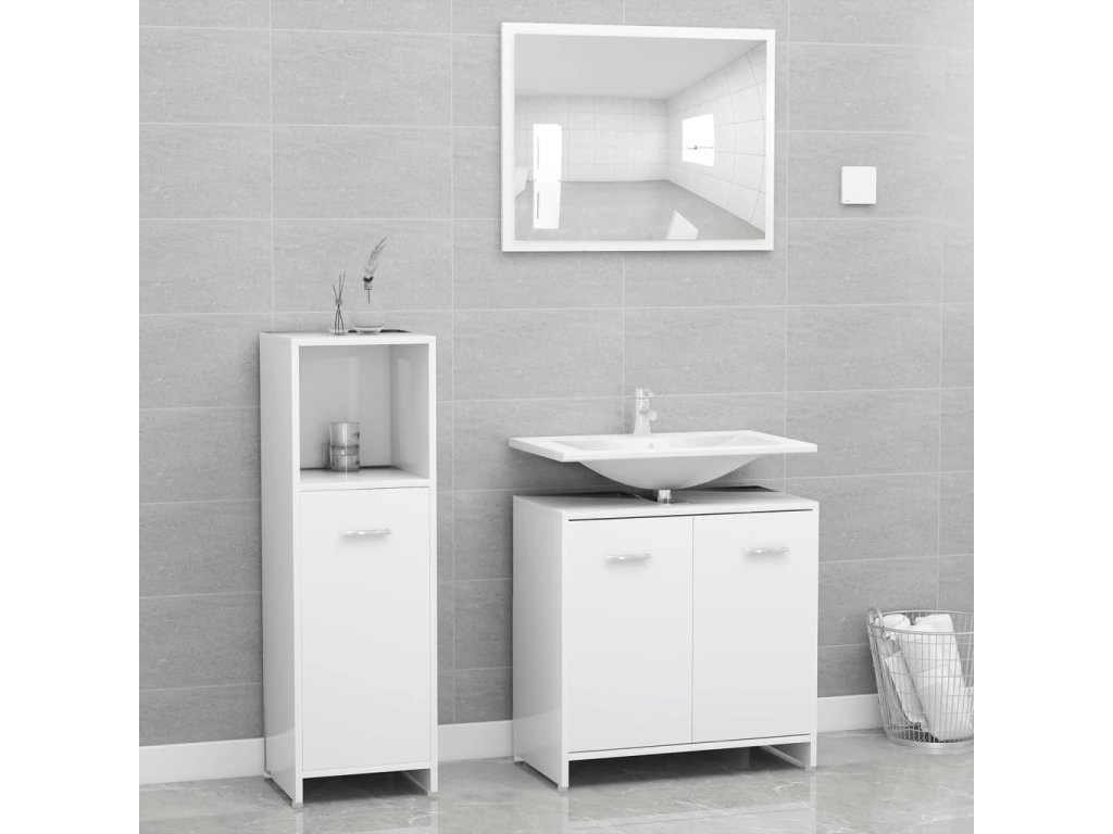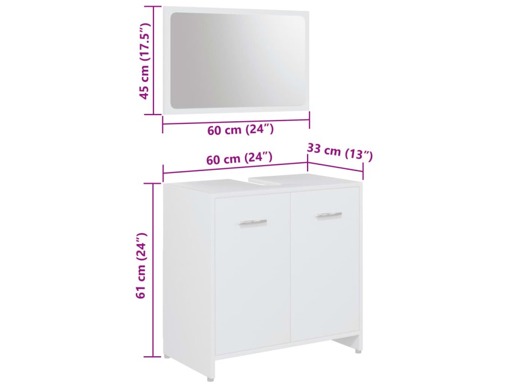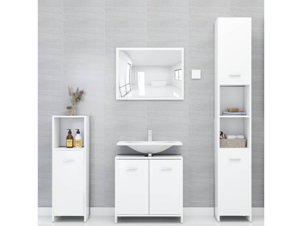 Súprava je vyrobená z prémiového kompozitného dreva, vďaka čomu je trvácna a stabilná. Elegantná stredne veľká skrinka má 3 priečinky a 1 dvierka a poskytuje množstvo priestoru na odkladanie rôznych toaletných potrieb. Skrinka pod umývadlo má 1 priečinok a 2 dvierka a poslúži ako ideálne miesto na hygienické potreby, kozmetiku či iné drobnosti. Na poličky si môžete prehľadne poukladať napríklad hrebene, mejkap, zubné kefky či zubné pasty, aby ste ich mali vždy poruke. Zrkadlo navyše dodá vášmu interiéru pôsobivý vzhľad. Súprava kúpeľňového nábytku sa dá ľahko očistiť navlhčenou handričkou.