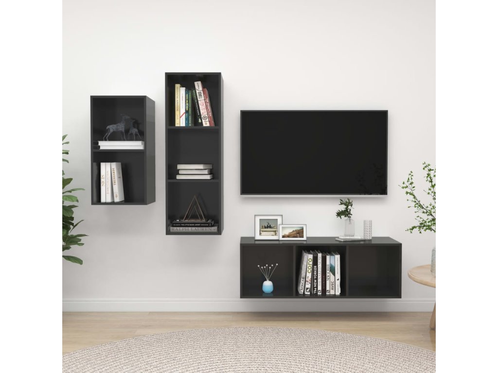 Táto sada závesných TV skriniek je vybavená veľkým úložným priestorom na uloženie rôznych predmetov a vo vašej domácnosti vytvorí praktický a pútavý doplnok.