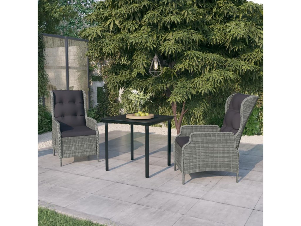 Praktická vonkajšia jedálenská súprava má oceľový rám, vďaka čomu je pevná a odolná. Záhradné polohovacie kreslá sú vyrobené z vodeodolného a bezúdržbového PE ratanu, čím sú ideálne na vonkajšie použitie. Hrubo čalúnené vankúše poskytnú extra pohodlie pri stolovaní. Poťah na vankúš má zips a dá sa oprať. Vďaka plynovému zdvíhaciemu mechanizmu je operadlo stoličky nastaviteľné, aby vyhovovalo vašej polohe. Dotykom tlačidla na boku sa dá operadlo sklopiť do pohodlnej polohy. Hladká sklenená doska stola sa ľahko čistí vlhkou handričkou a je vynikajúca na umiestnenie jedál, nápojov a iných dekoratívnych predmetov.