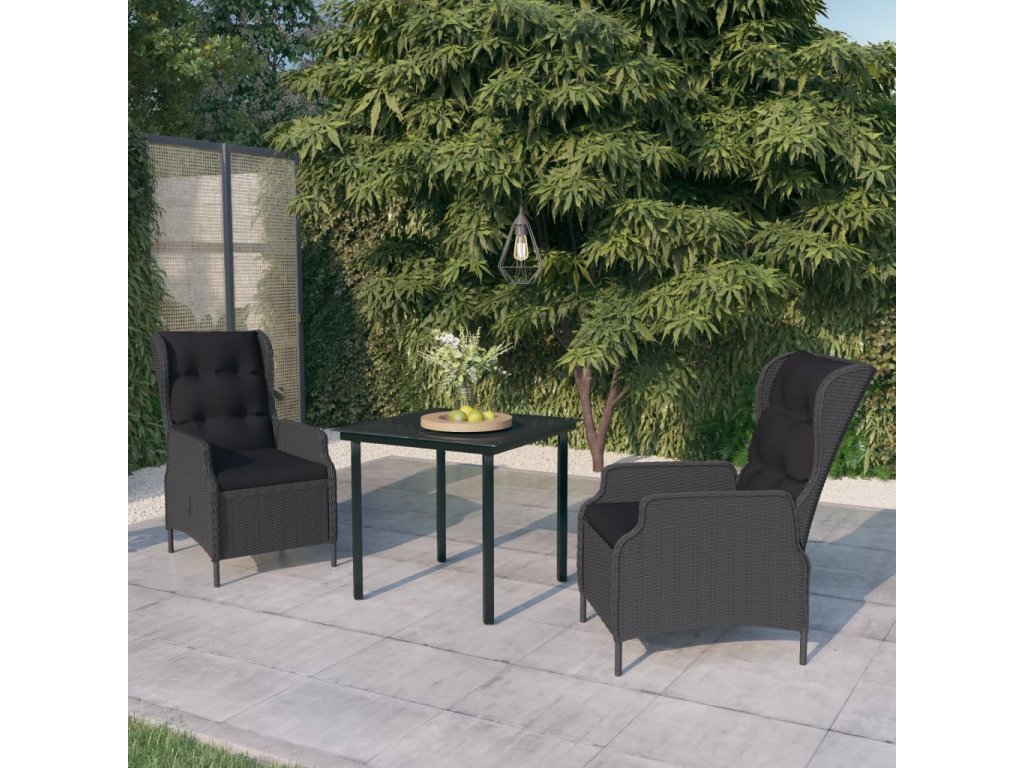 Praktická vonkajšia jedálenská súprava má oceľový rám, vďaka čomu je pevná a odolná. Záhradné polohovacie kreslá sú vyrobené z vodeodolného a bezúdržbového PE ratanu, čím sú ideálne na vonkajšie použitie. Hrubo čalúnené vankúše poskytnú extra pohodlie pri stolovaní. Poťah na vankúš má zips a dá sa oprať. Vďaka plynovému zdvíhaciemu mechanizmu je operadlo stoličky nastaviteľné, aby vyhovovalo vašej polohe. Dotykom tlačidla na boku sa dá operadlo sklopiť do pohodlnej polohy. Hladká sklenená doska stola sa ľahko čistí vlhkou handričkou a je vynikajúca na umiestnenie jedál, nápojov a iných dekoratívnych predmetov.