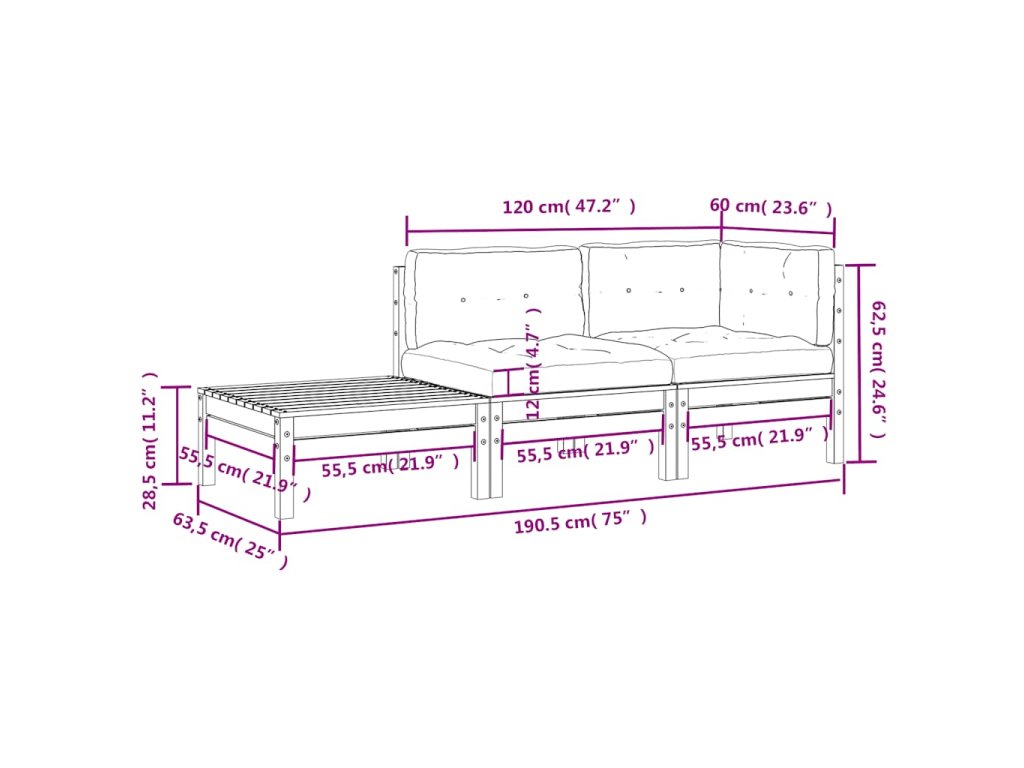 Terasová sedacia súprava je vyrobená z masívneho borovicového dreva, vďaka čomu je robustná a stabilná. Vankúše jej dodávajú dodatočné pohodlie. Môžete ju skombinovať s inými modulárnymi segmentmi a vytvoriť si tak svoje vlastné konfigurácie záhradného posedenia!