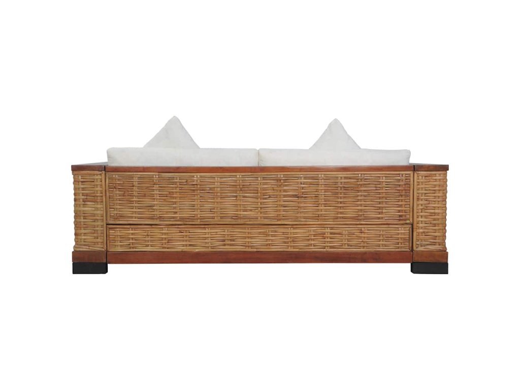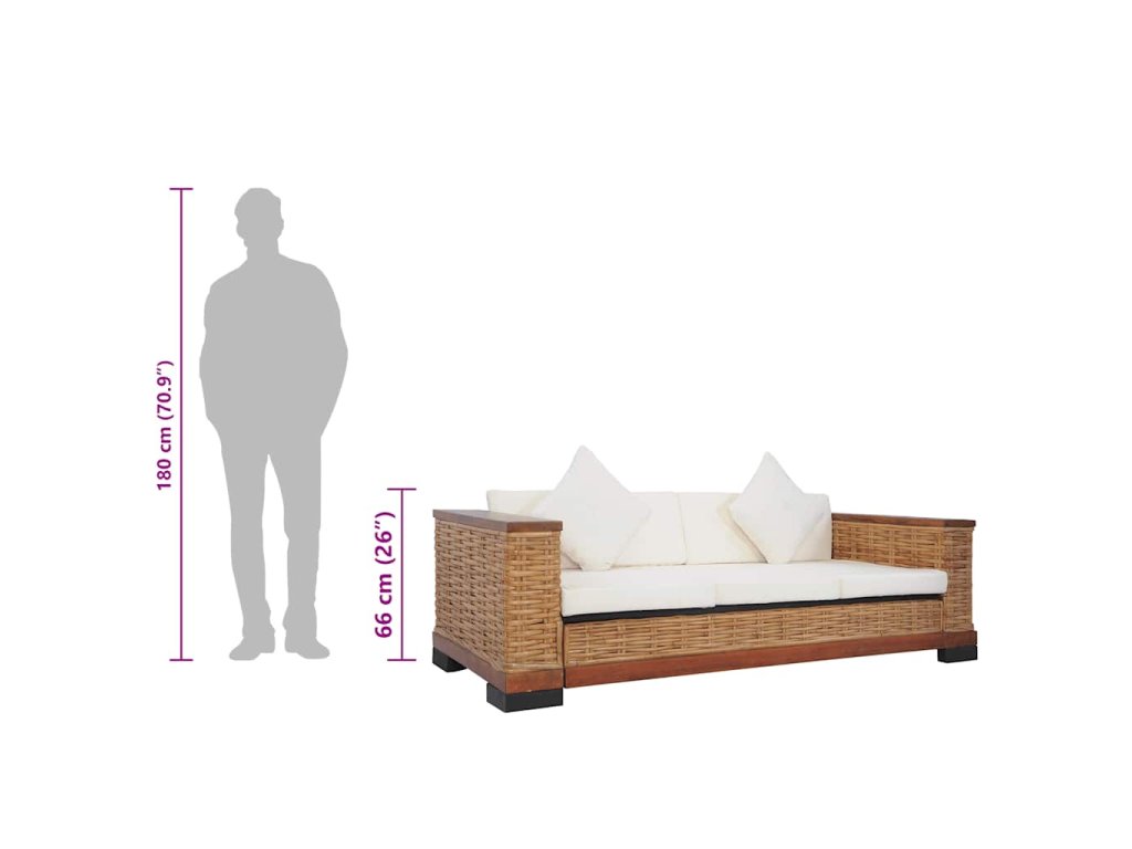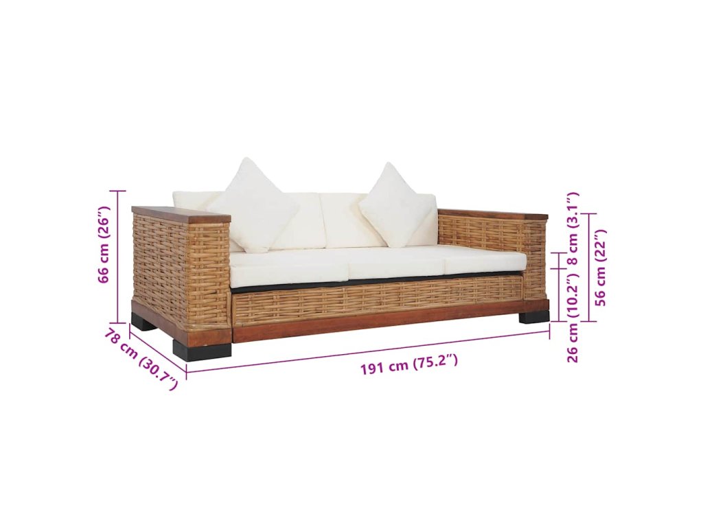 Vďaka materiálu z pravého ratanu sa pohovka jednoducho čistí, je odolná a vhodná na každodenné použitie. Má pevný drevený rám, ktorý je skutočne trvácny a stabilný. Hrubé podsedáky a vankúše sú veľmi pohodlné a vďaka odnímateľným návliečkam sú aj umývateľné. Široké lakťové opierky zaručujú pohodlné sedenie.