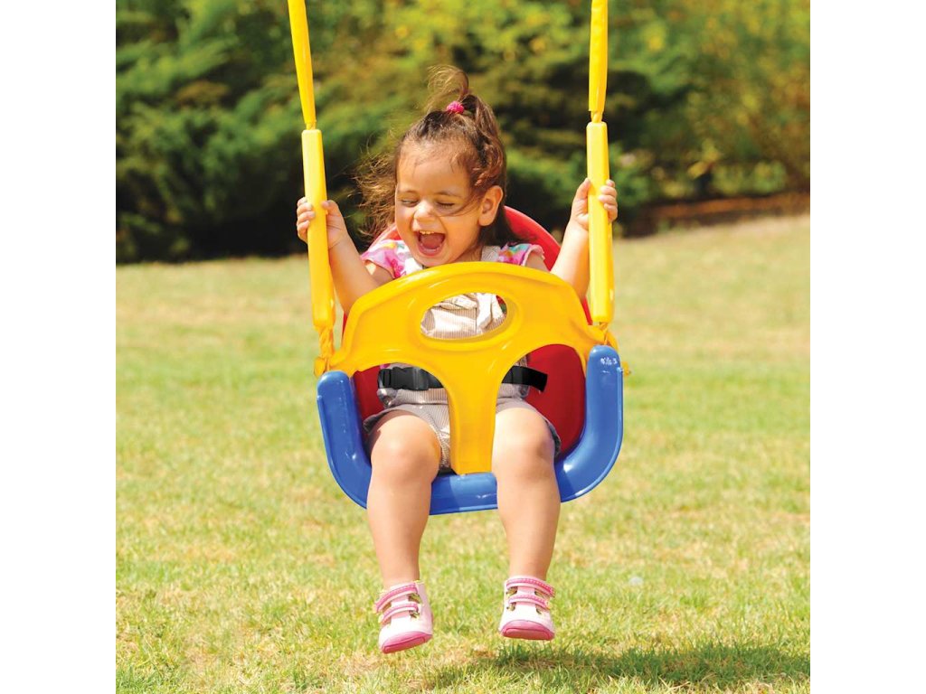 - Dostatočná bezpečnosť: Pás a vysoké operadlo udrží vaše dieťa pevne na sedadle. T-tyč poskytuje dodatočnú bezpečnosť, najmä pri prvých pokusoch o hojdanie, a poskytuje vášmu dieťaťu potrebnú priľnavosť.
