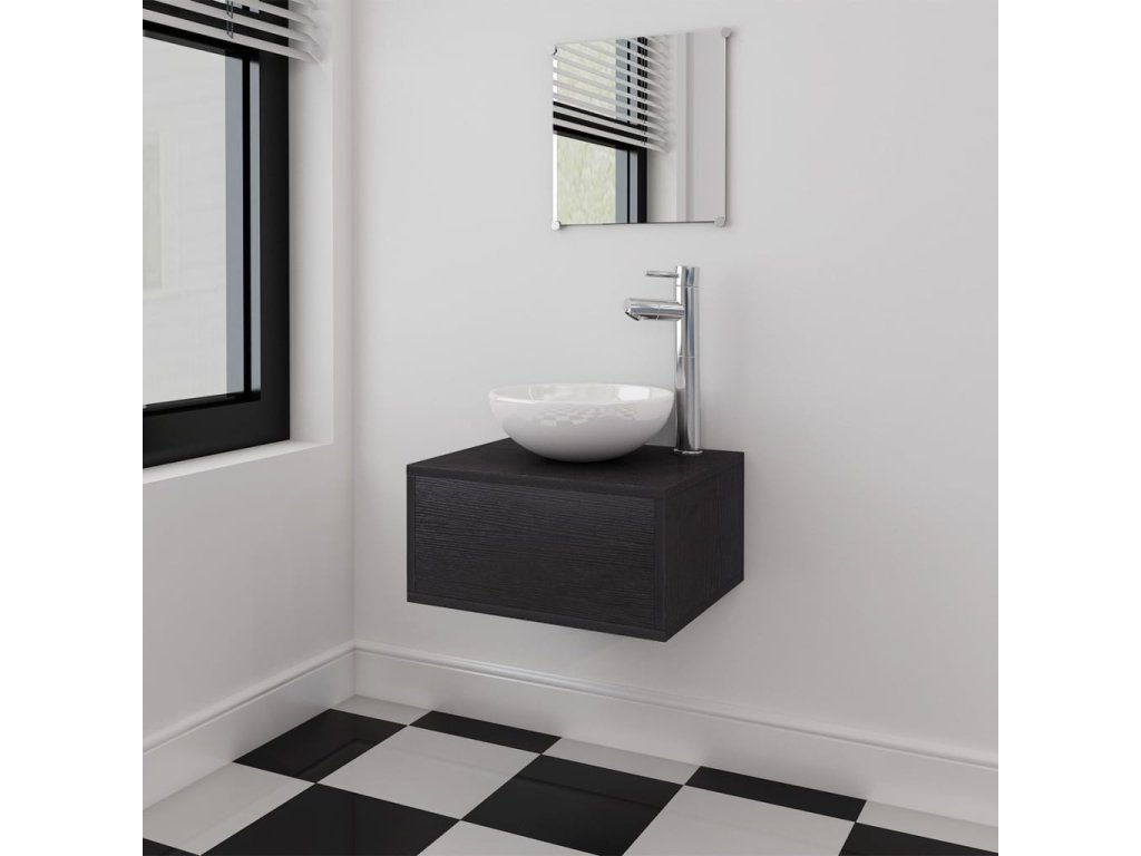 Sada kúpeľňového nábytku obsahuje tiež aj zrkadlo a skrinku pod umývadlo. Kompaktná veľkosť a minimalistický dizajn z nej robia skvelý doplnok do každej modernej kúpeľne. Táto toaletná jednotka, vyrobená z kvalitnej drevotriesky, je veľmi pevná a odolná.