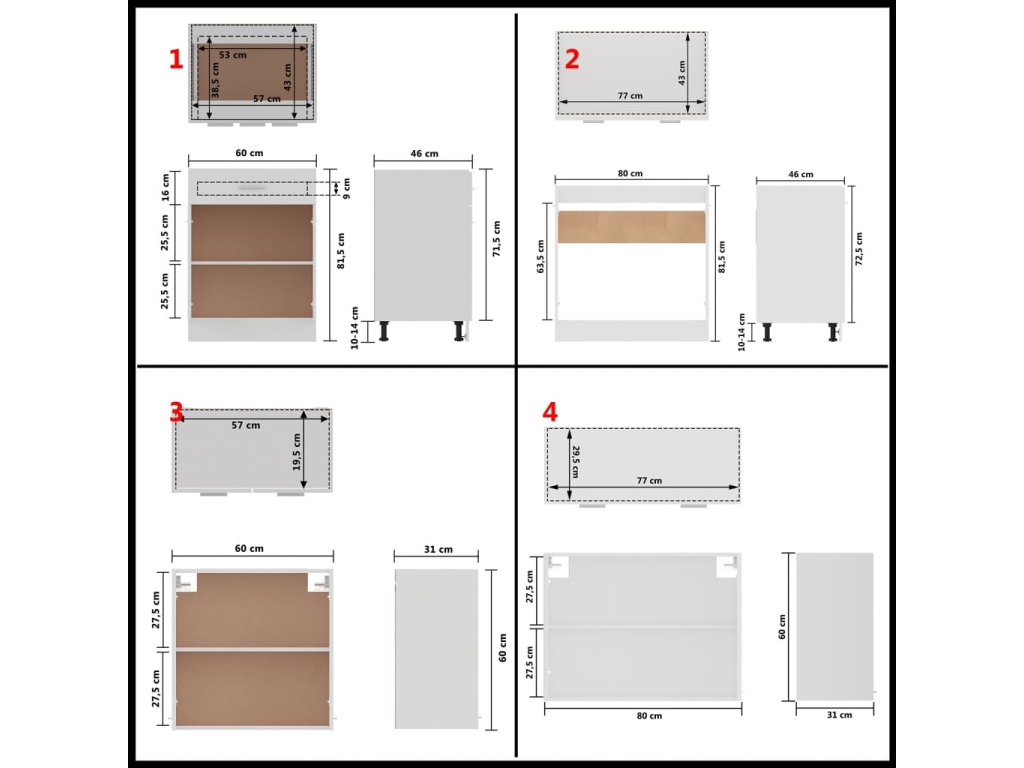 Táto 4-dielna kuchynská súprava skriniek s elegantným dizajnom vám umožní optimálne využiť priestory v kuchyni, pretože vám poskytne množstvo miesta na odkladanie osobných vecí!