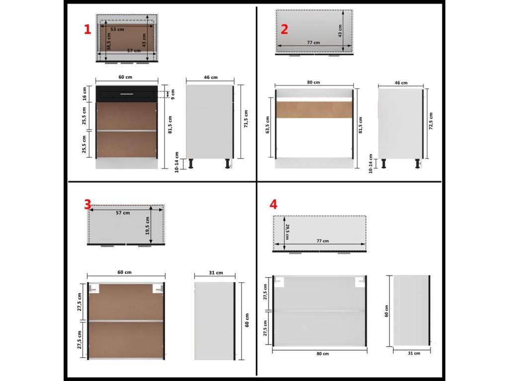 - 1 x Spodná zásuvková skrinka: 60 x 46 x 81,5 cm (Š x H x V)