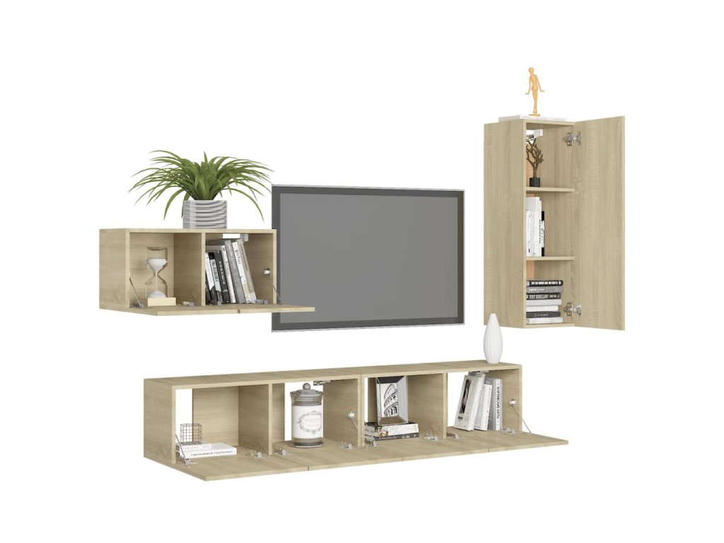 Táto sada závesných TV skriniek je vybavená veľkým úložným priestorom na uloženie rôznych predmetov a vo vašej domácnosti vytvorí praktický a pútavý doplnok.
