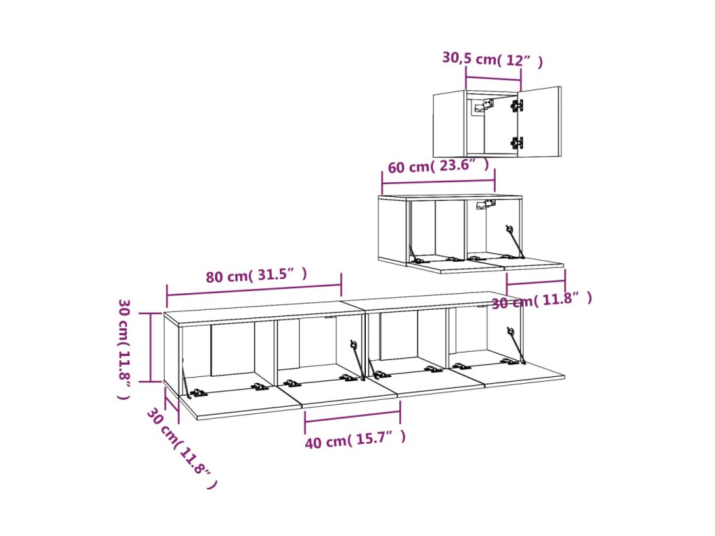 - Rozmery spodnej TV skrinky (každá): 80 x 30 x 30 cm (Š x H x V)