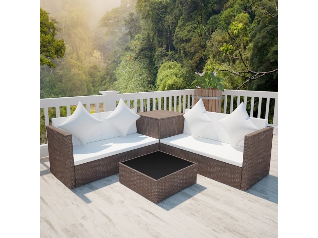 Sedacia súprava je vyrobená z ratanu, ktorý je vodeodolný a odolný voči vplyvom počasia, takže sa dá ľahko očistiť, je trvácny a vhodný aj na každodenné používanie. Pevný oceľový rám s práškovou povrchovou úpravou zaručuje dlhú životnosť sedačky. Zároveň je tento nábytok ľahký, a tak ho môžete preniesť, kam potrebujete. Úložná truhlica je odolná voči vplyvom počasia a poskytne ideálne miesto na odloženie diek, vankúšov, hračiek, kníh a ďalších predmetov.